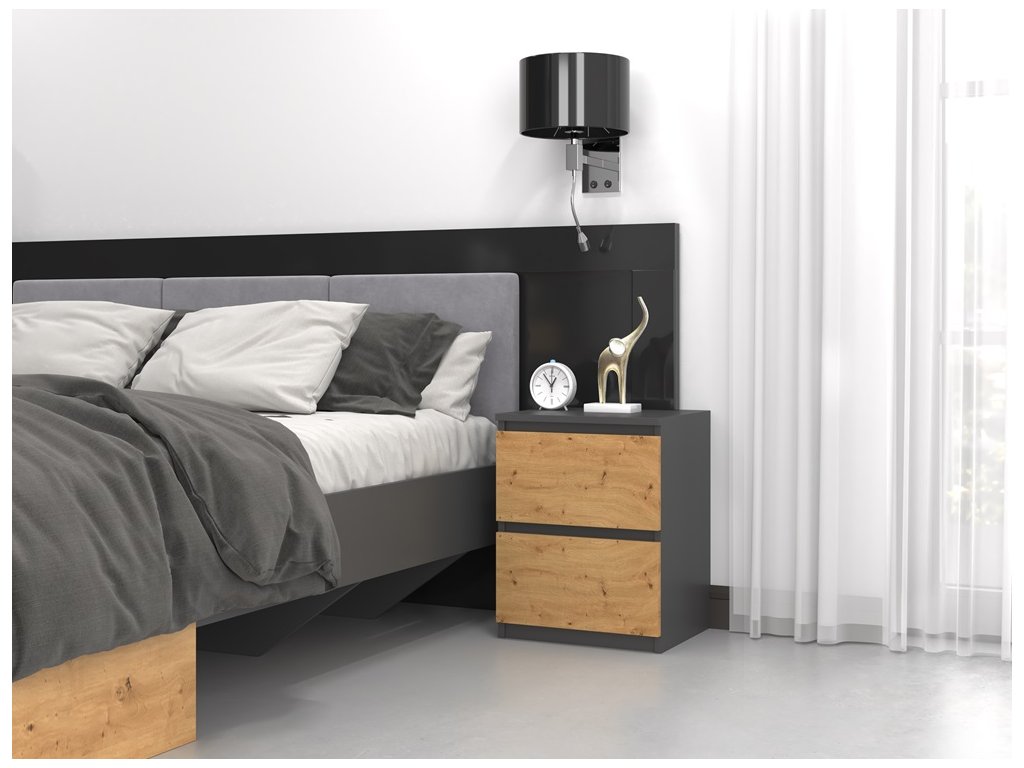 Moderní noční stolek 2W Vám skvěle zapadne do Vaší ložnice. Stolek má dva šuplíky, kde si opravdu odložíte vše co potřebujete. Je vyroben z kvalitní LTD desky, která je nenáročná na údržbu a hrany má chráněno ABS páskou. Stolek má bezúchytový systém otevírání, takže vám v prostoru nebudou zavazovat žádné úchyty a zároveň to posílí jeho moderní design.