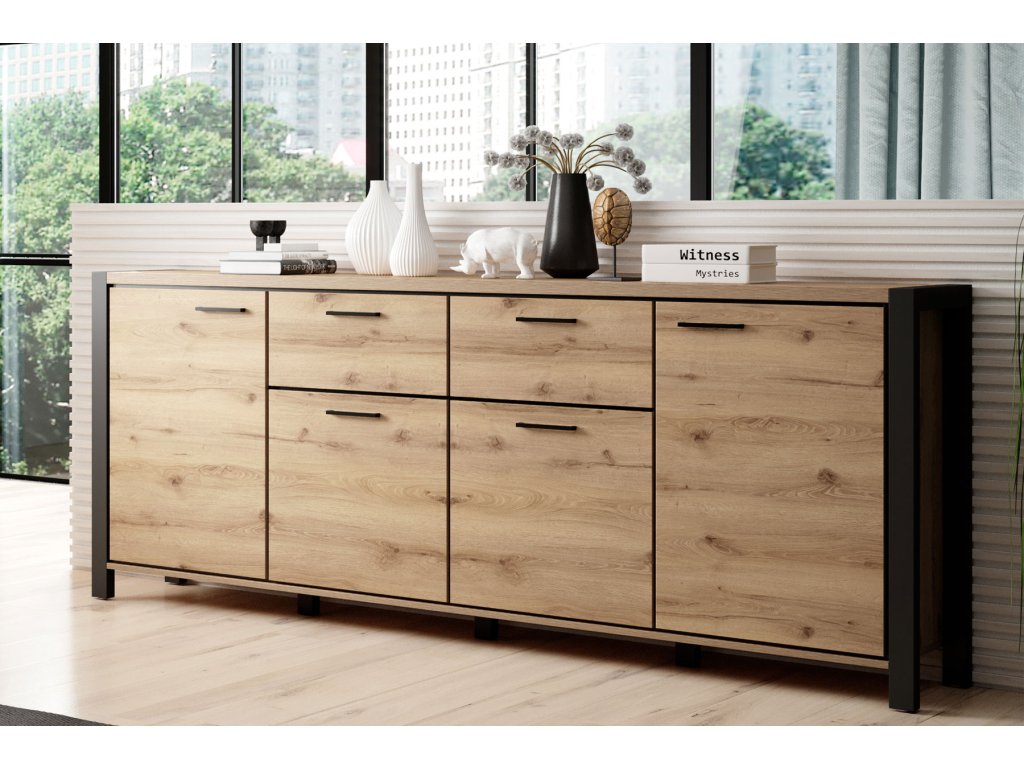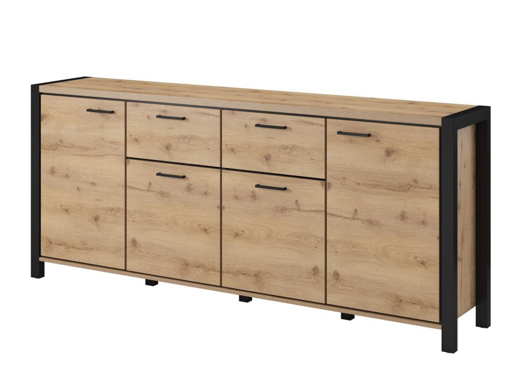 Komoda AKTUAL 25 má čtyři dvířka, za kterými se nacházejí praktické police a dvě zásuvky.