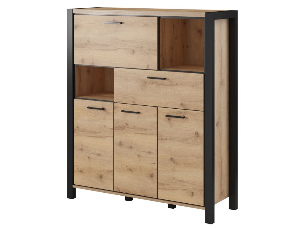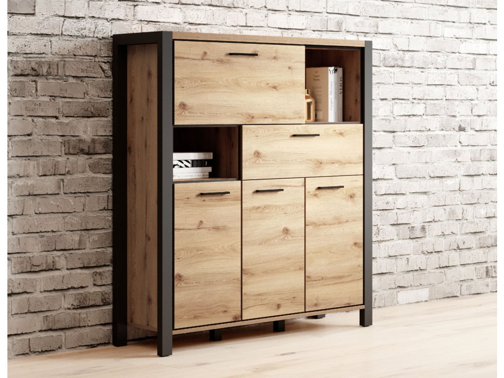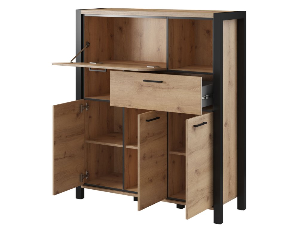 Komoda AKTUAL 46 má troje dvířka za kterými se nacházejí praktické police, jednu zásuvku, dvě odkládací police a jedny barová dvířka.