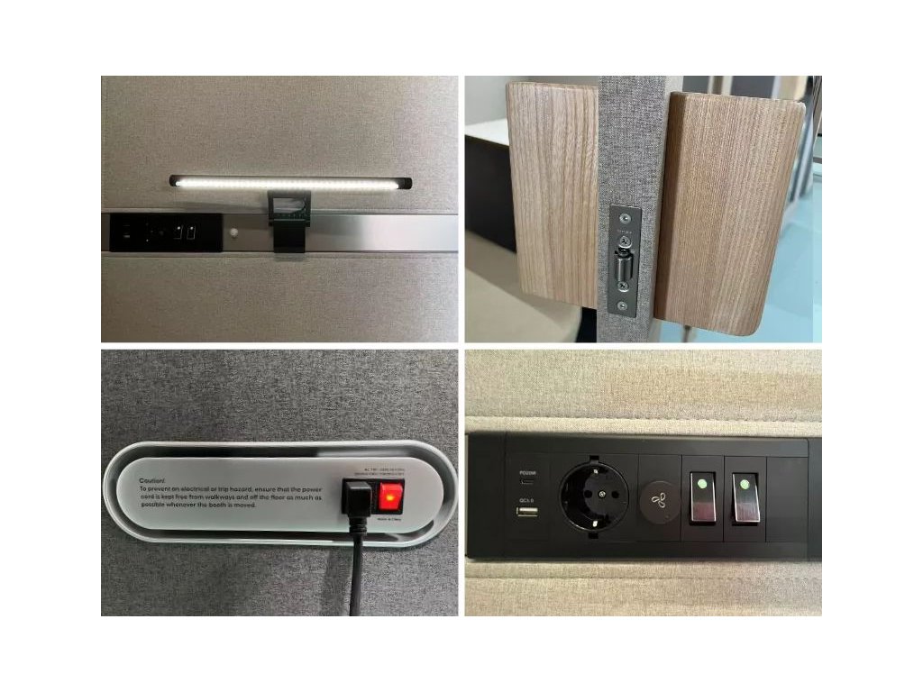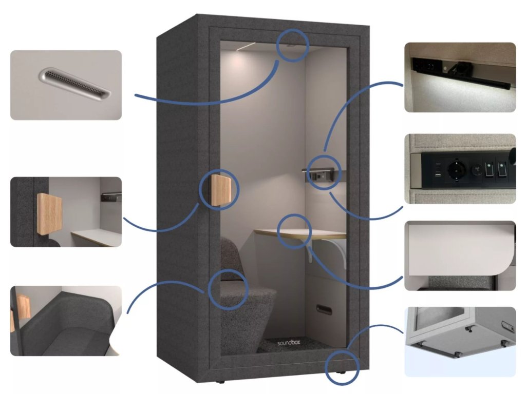 Kabina je vybavena prosklenými dveřmi, LED osvětlením, ventilačním systémem, USB portem a elektrickou zásuvkou 220 V. Konstrukce je tvořena kombinací akustických materiálů určených ke snížení hluku. Díky skrytým odnímatelným kolečkům je kabina mobilní a snadno přemístitelná.