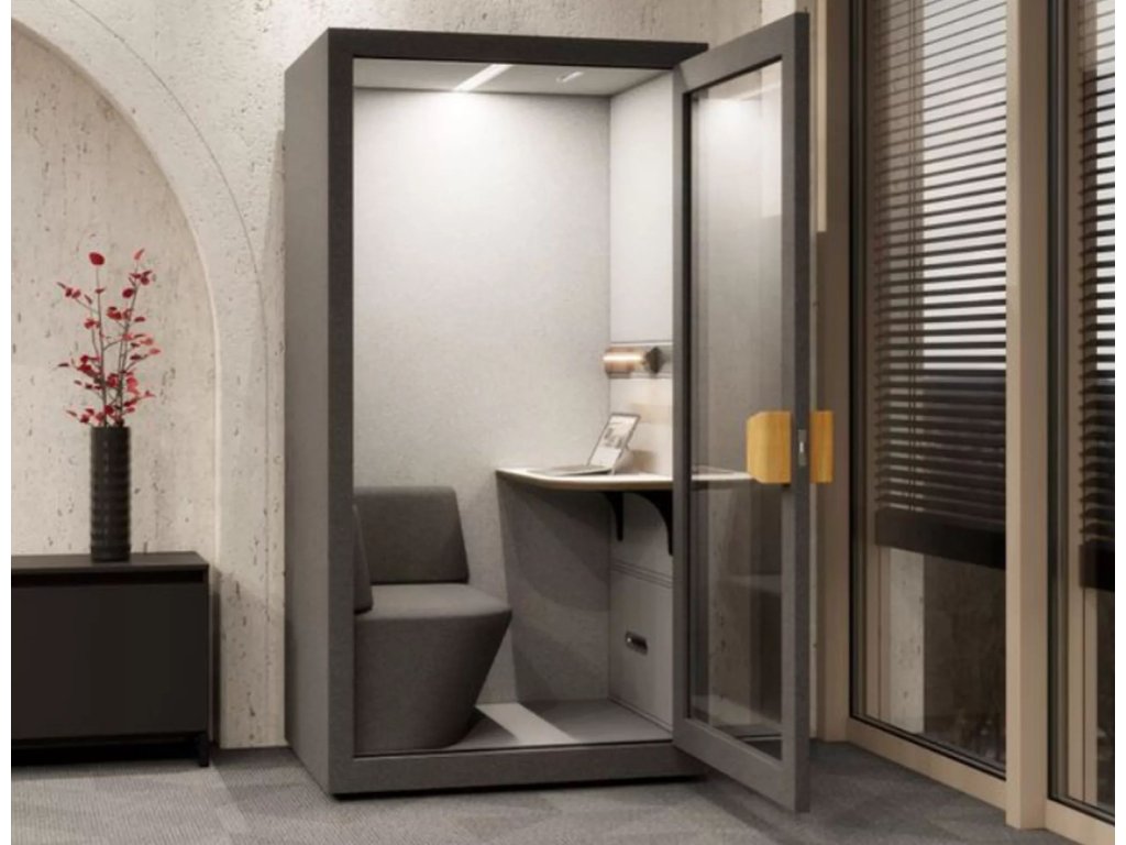 Jednoosobová akustická zvukotěsná kabina je určena pro telefonní hovory, online schůzky, videokonference nebo individuální práci v prostředí open space kanceláří, úřadů, hotelů, letišť i domácností. Poskytuje uzavřený prostor se sníženou hlučností, který minimalizuje rušení okolí a zároveň omezuje vnější hluk.