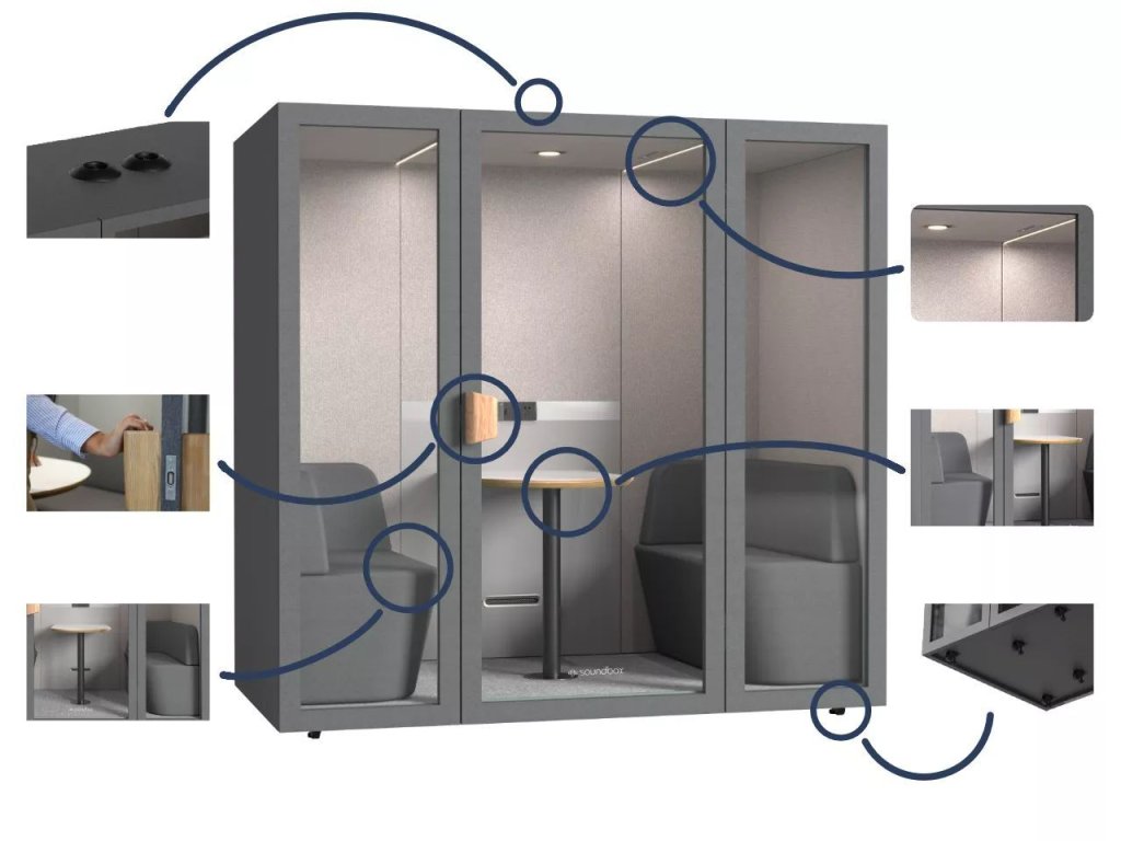 Kabina je vybavena prosklenými dveřmi, LED osvětlením, ventilačním systémem a elektrickými zásuvkami. Konstrukce je tvořena kombinací akustických materiálů určených ke snížení hluku. Díky skrytým kolečkům je kabina mobilní.
