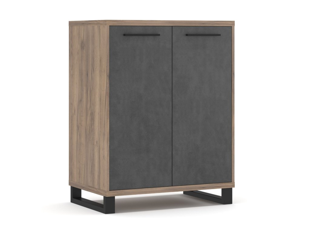 Dvoudveřová komoda má uvnitř dvě police, kovové úchyty vizuálně doplňují černé kovové nohy.