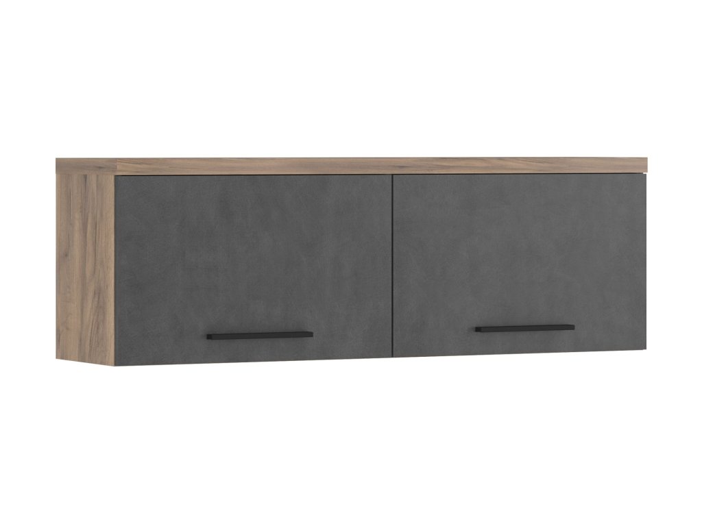 Dvoudveřovou závěsnou skříňku je vhodné zavěsit nad psací stůl. Kovové úchyty doplňují moderní design nábytku.