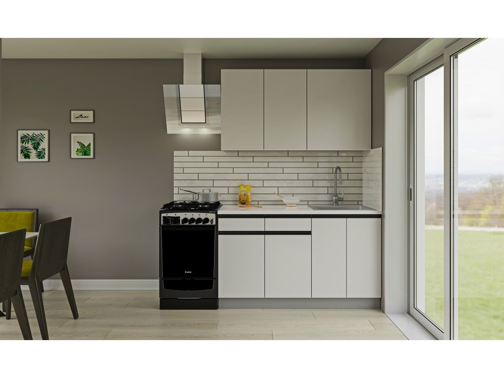 Kuchyňské skříňky jsou vyrobeny z kvalitních LTD desek. Jejich údržba je nenáročná. Korpus je v šedé barvě. Dvířka jsou v bílém provedení. Mají integrované úchyty typu GOLA.