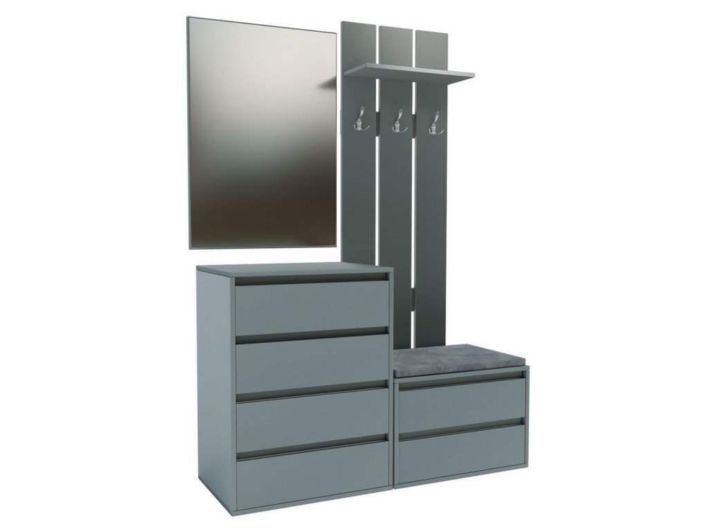 | Sestava obsahuje: | Čtyřzásuvková komoda (ŠxVxH): 60 x 80 x 42 cm Dvouzásuvková skříňka na boty s polštářkem (ŠxVxH): 60 x 40 x 42 cm Věšákový panel s odkládací policí (ŠxVxH): 60 x 138 x 23,2, zrcadlo |