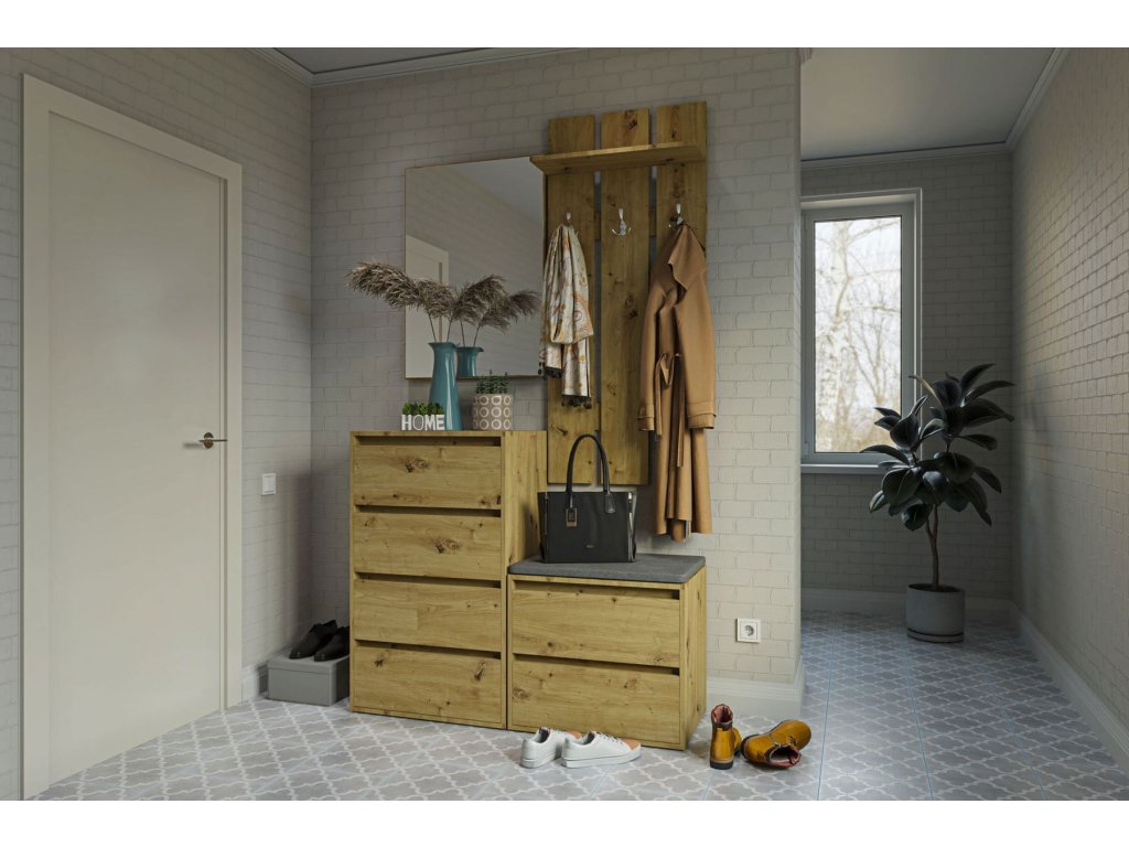 Předsíňová sestava AMARO zaujme elegantním provedením i velmi funkčním využitím prostoru. Díky svým praktickým rozměrům se vejde i do menších prostor. Zvolená barva dub Artisan se hodí do jakéhokoli interiéru. Polštářek je v šedé barvě .