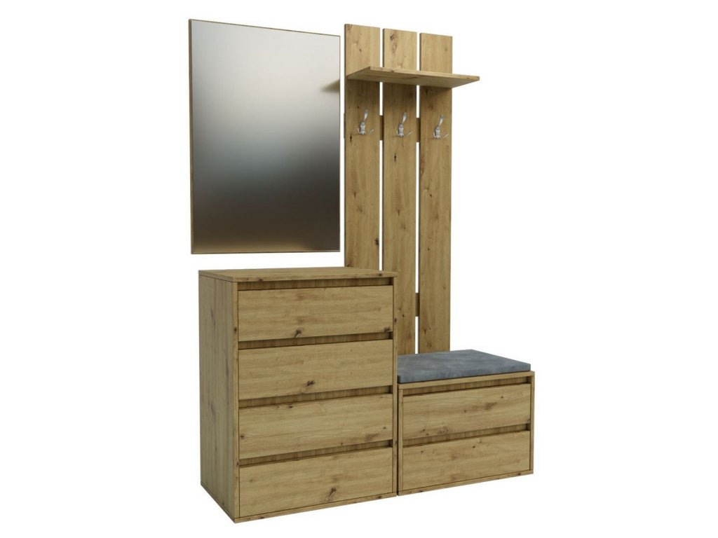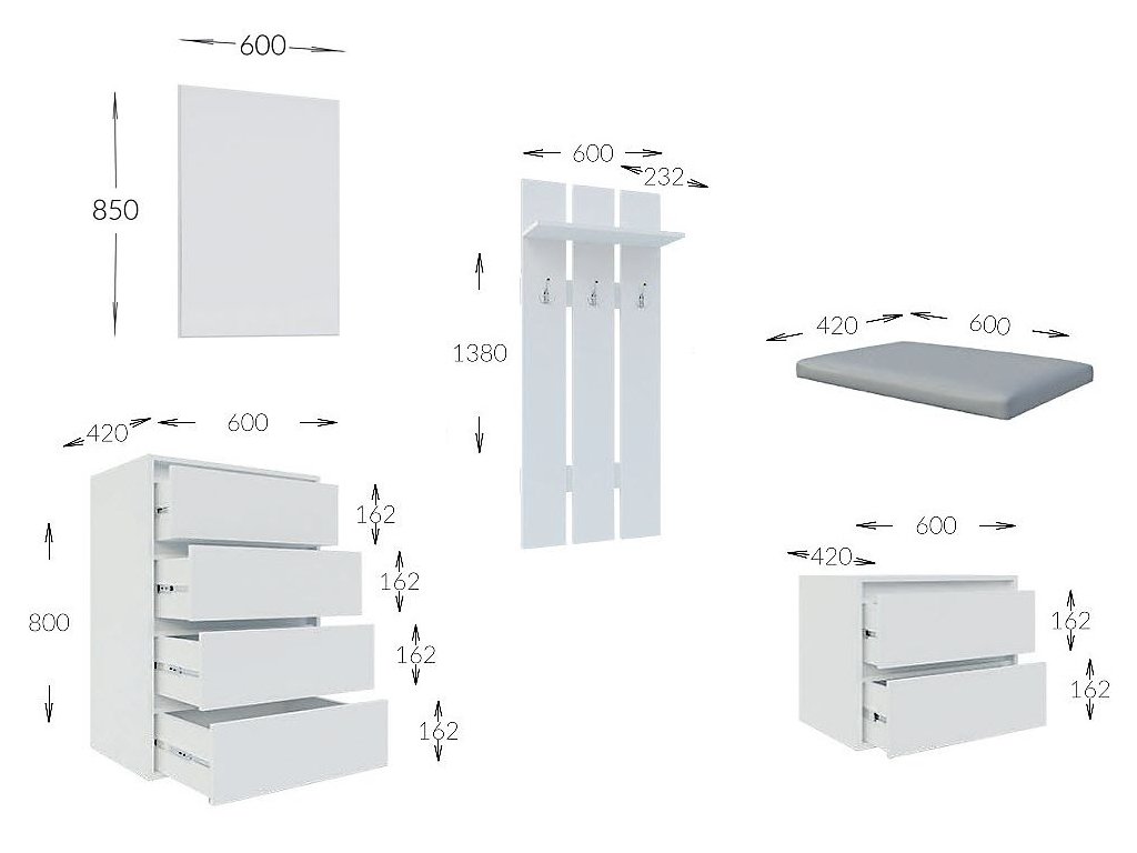 | Sestava obsahuje: | Čtyřzásuvková komoda (ŠxVxH): 60 x 80 x 42 cm Dvouzásuvková skříňka na boty s polštářkem (ŠxVxH): 60 x 40 x 42 cm Věšákový panel s odkládací policí (ŠxVxH): 60 x 138 x 23,2, zrcadlo |