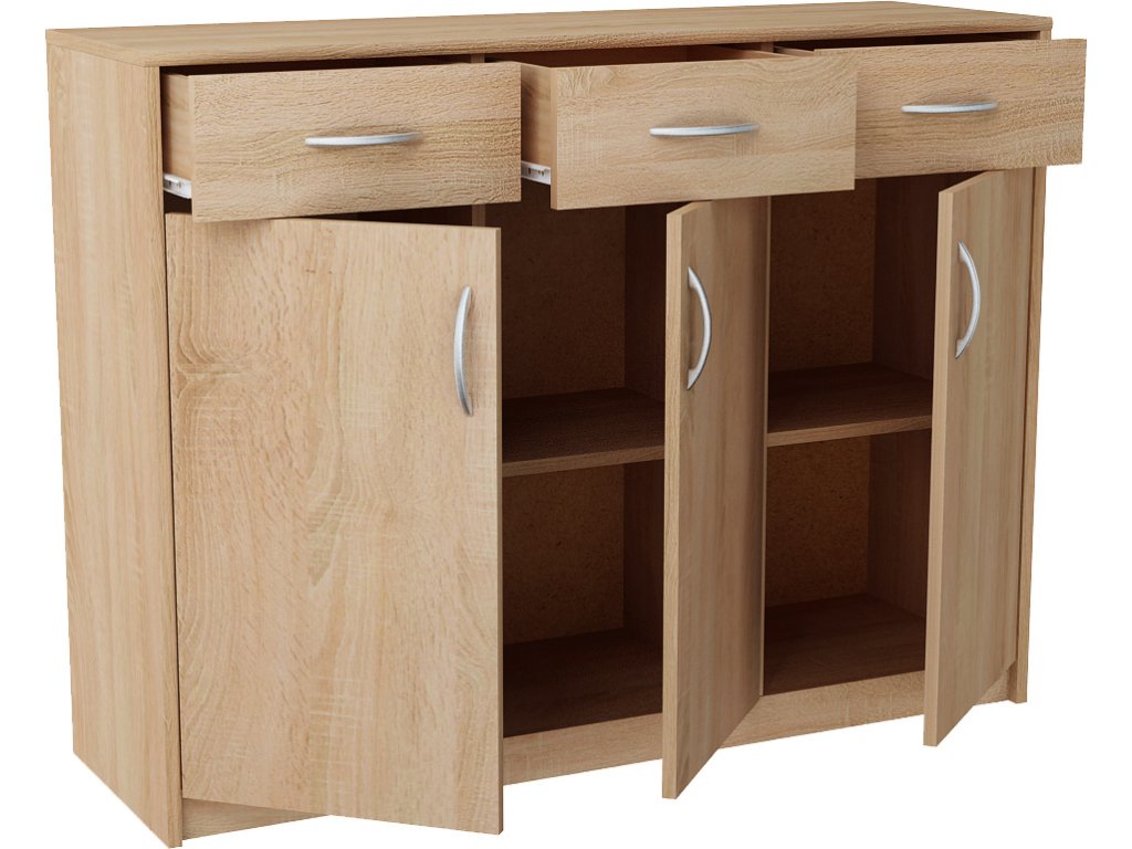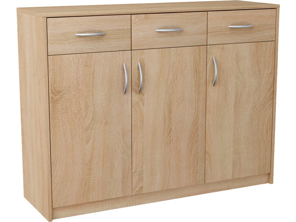 Třídvířková komoda ANES se třemi zásuvkami, je vyrobena z kvalitní LTD desky. Korpus komody a také její dvířka jsou v oblíbeném barevném provedení dub sonoma. K dispozici máte dalších 5 barevných provedení na výběr. Pojezdy v zásuvkách jsou kovové s plastovými kolečky. Vnitřek komody tvoří police. Úchytky jsou z plastu v barvě aluminium oblého tvaru. Dodáváme v demontovaném stavu.Doplňkové parametry