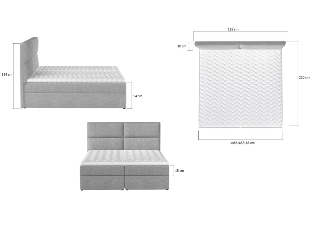 Rozměry postele (š,v,h): 165 x 124 x 210 cm. Výška spací plochy: 54 cm. Výška nožiček: 3 cm. Spací plocha: 160 x 200 cm. Výška matrace: 15 cm. Výška topperu: 4 cm.