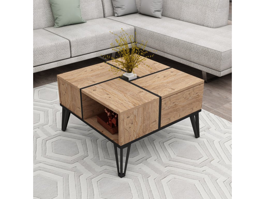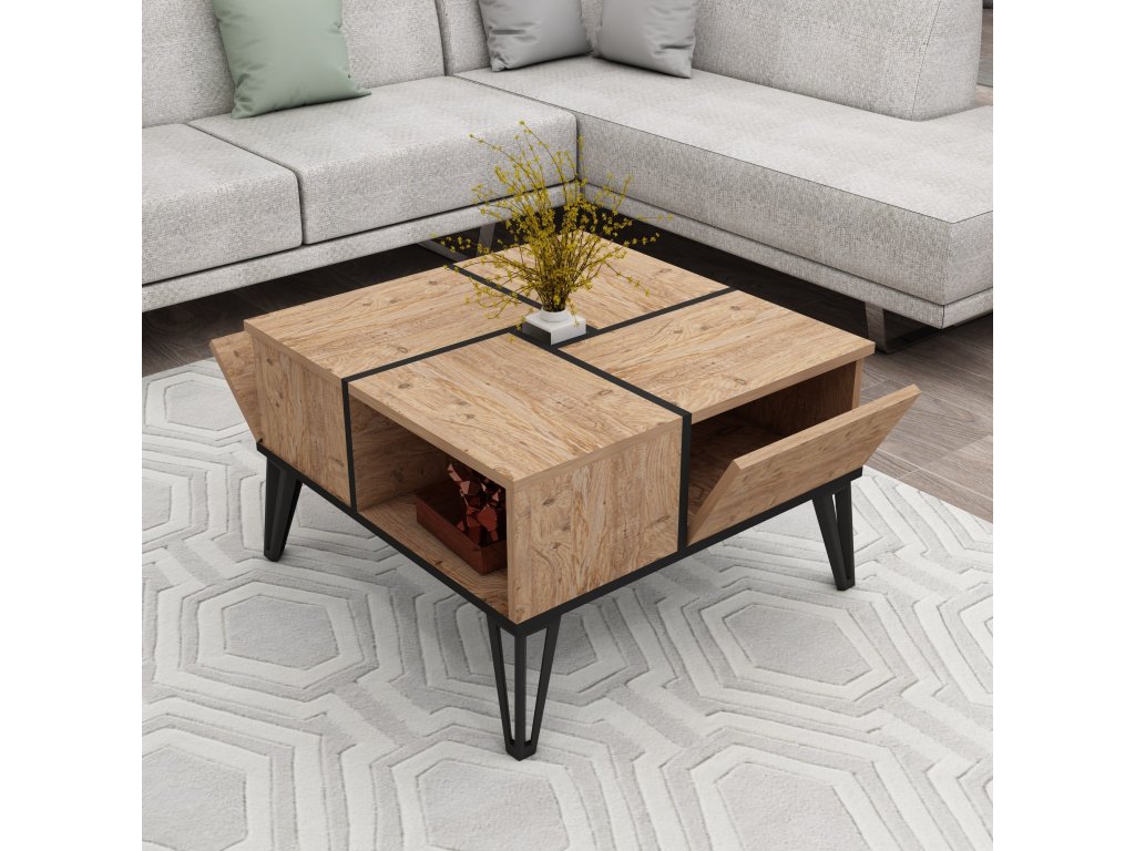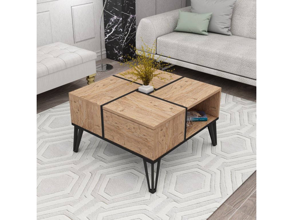 Tento konferenční stolek s harmonickou kombinací barev atlantické borovice a černé dodá každé místnosti nádech sofistikovanosti. Kontrastní barvy vytvářejí vizuálně přitažlivý ústřední bod, díky čemuž se stane skutečným prvkem vaší domácnosti.