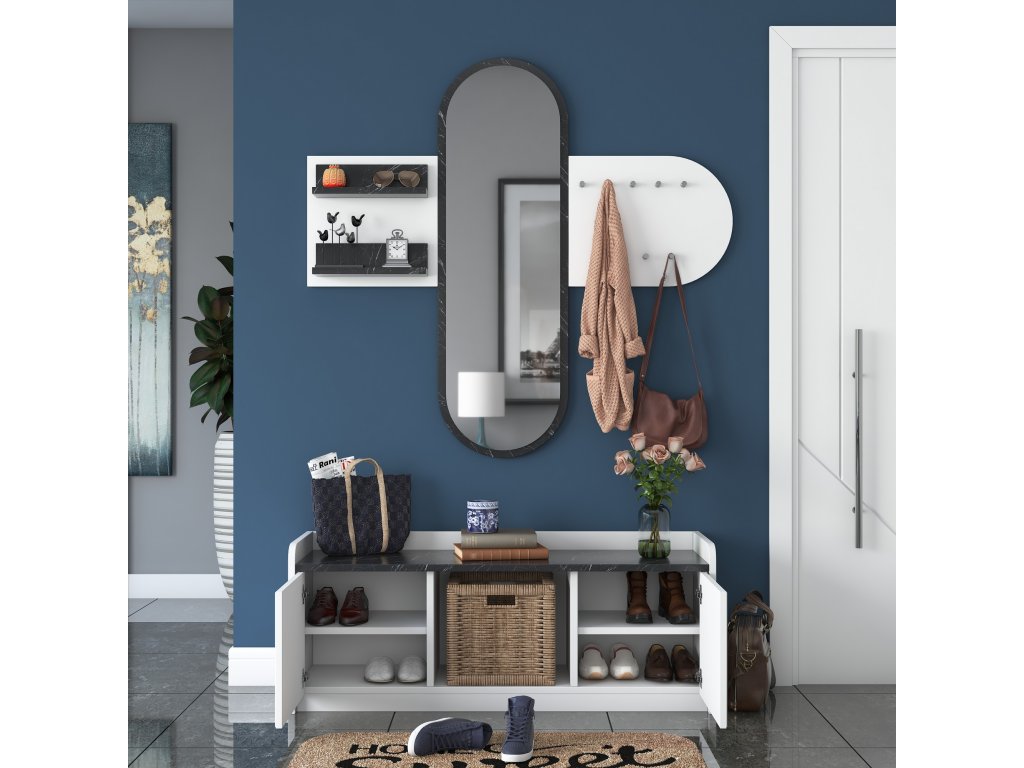 Předsíňová sestava ANTHONY je vybavena praktickým botníkem, závěsným věšákem s policemi a zrcadlem, které opticky zvětšuje prostor a přidává mu na světlosti. Dvě dvířka poskytují dostatek úložného prostoru pro vaše obuv a doplňky, zatímco věšák a police zajistí pohodlné odkládání kabátů a dalších předmětů.