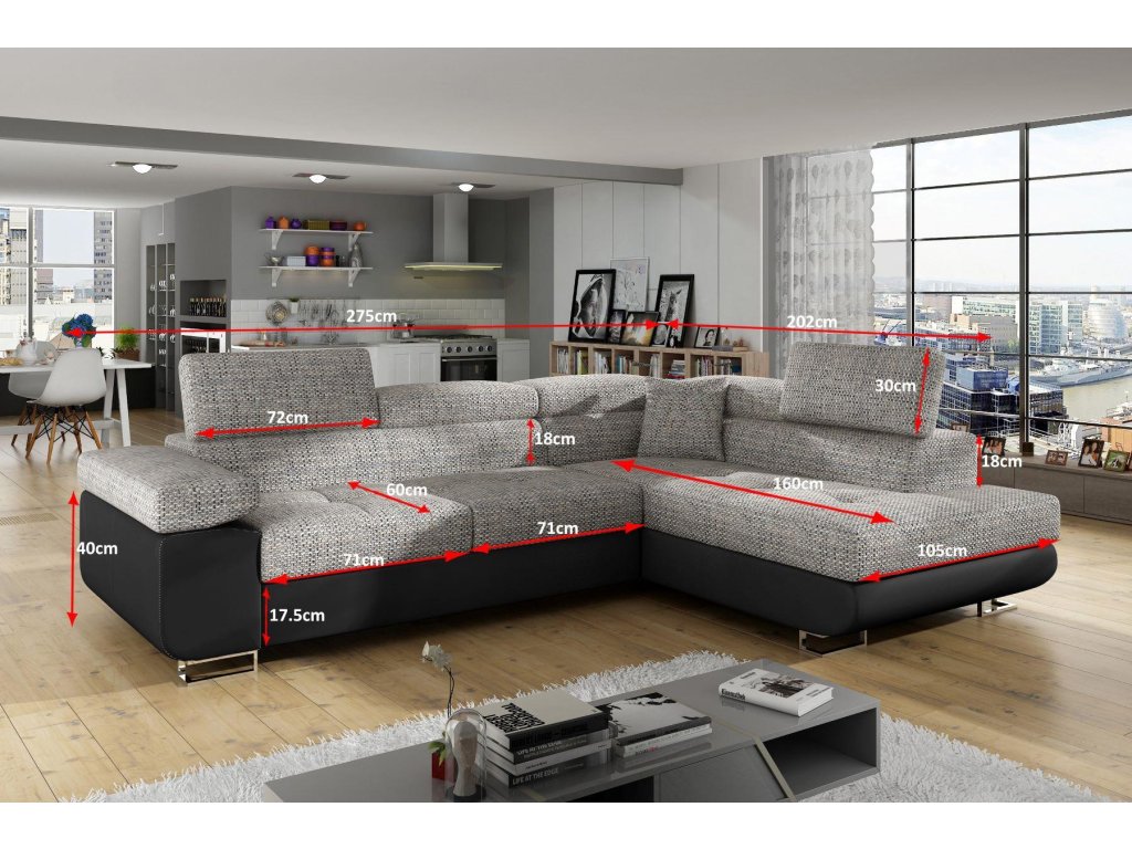 Rozměry sedačky (ŠxVxH): 275 x 90 x 202 cm. Výška sedu je 43 cm, hloubka 60 cm.