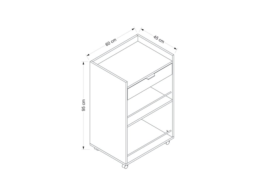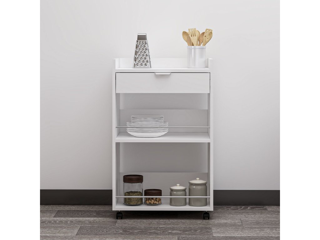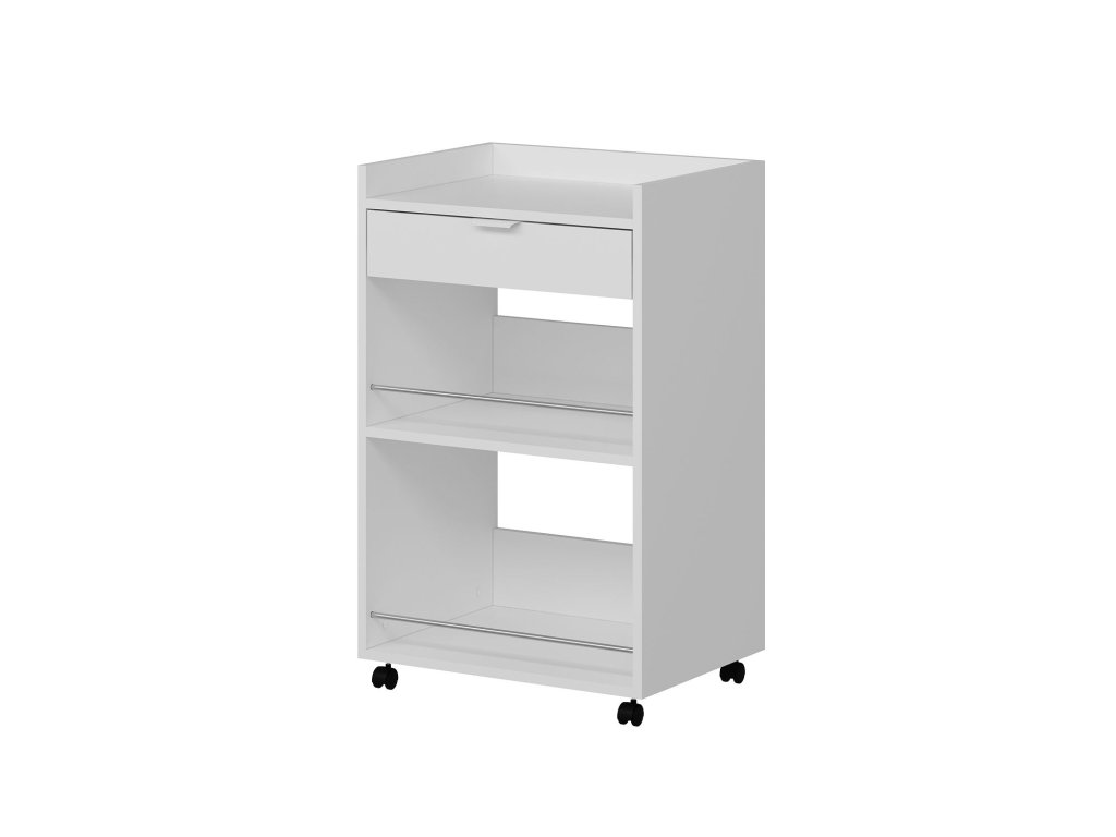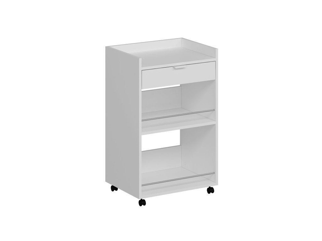 Regál na kolečkách ARCH je elegantní a víceúčelový kus nábytku, který skvěle zapadne do moderní kuchyně nebo obývacího pokoje. Jeho skandinávský design v bílé barvě nabízí čistý a minimalistický vzhled, zatímco zásuvka a odkládací police zajišťují dostatek úložného prostoru pro vaše potřeby.