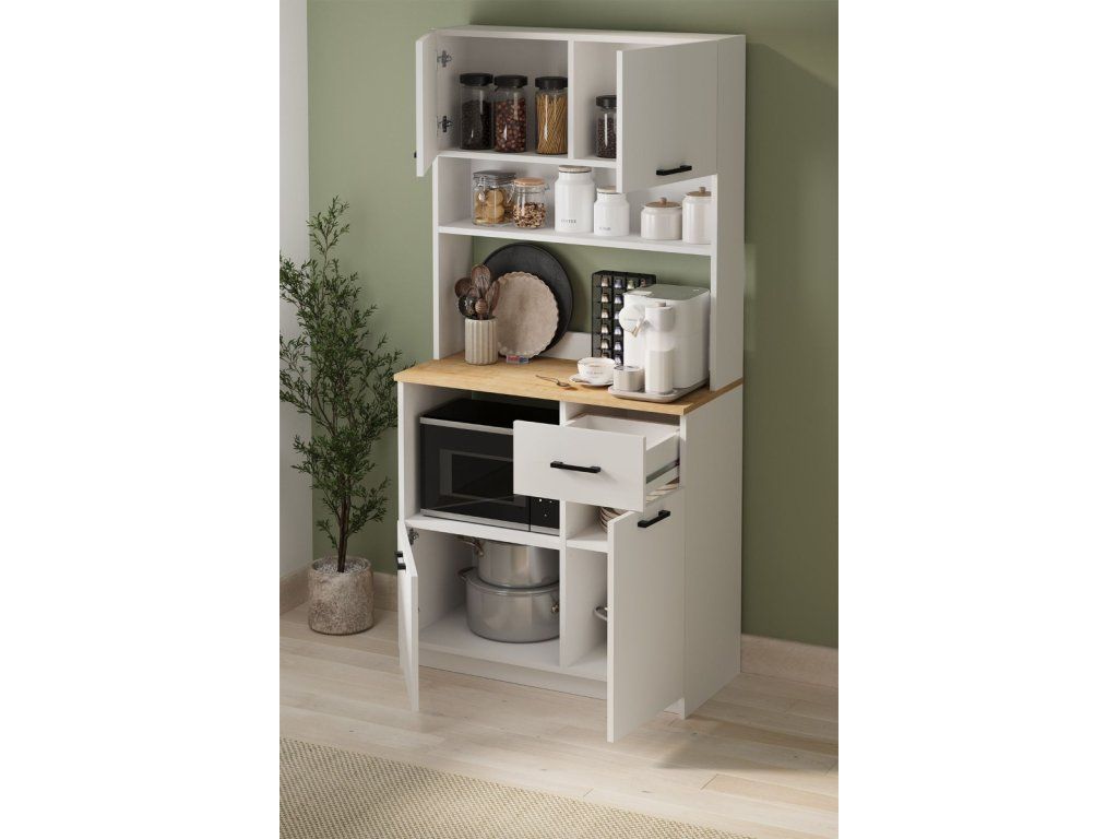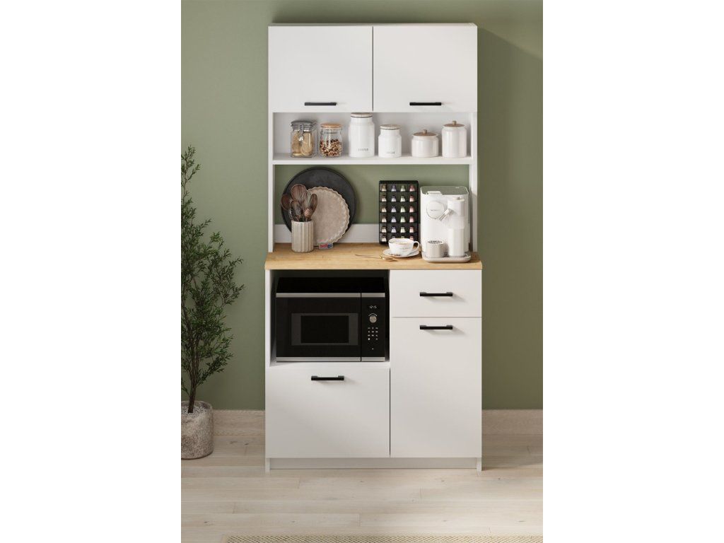 Skříňka do kuchyně ARIANA je v nadčasovém bílém provedení díky čemuž dokonale zapadne do různých interiérů. Skříňka na mikrovlnku s pracovní plochou poskytuje dostatek úložného prostoru i pohodlné místo pro přípravu jídel. Otevřené i uzavíratelné části umožňují přehledné uspořádání všech kuchyňských potřeb. Skříňka je navržena tak, aby šetřila místo a zároveň poskytla praktickou pracovní desku v dekoru dub safírový. Kromě prostoru pro mikrovlnnou troubu disponuje také zásuvkou a spodními skříňkami, které jsou ideální pro uložení nádobí nebo potravin. Skříňka je vyrobena z kvalitních LTD desek, které jsou nenáročné na údržbu. Jejich tloušťka je 18 mm.