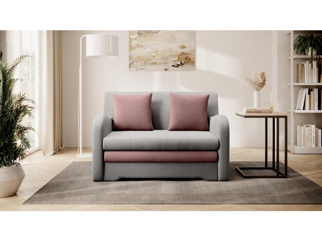 Rozkládací pohovka ARIBA – elegantní a praktický doplněk pro váš domov. Tato rozkládací pohovka je ideálním řešením pro malé prostory nebo jako dodatečné pohodlné lůžko pro vaše hosty. Barevná kombinace šedé a růžové se skvěle hodí do každého interiéru.