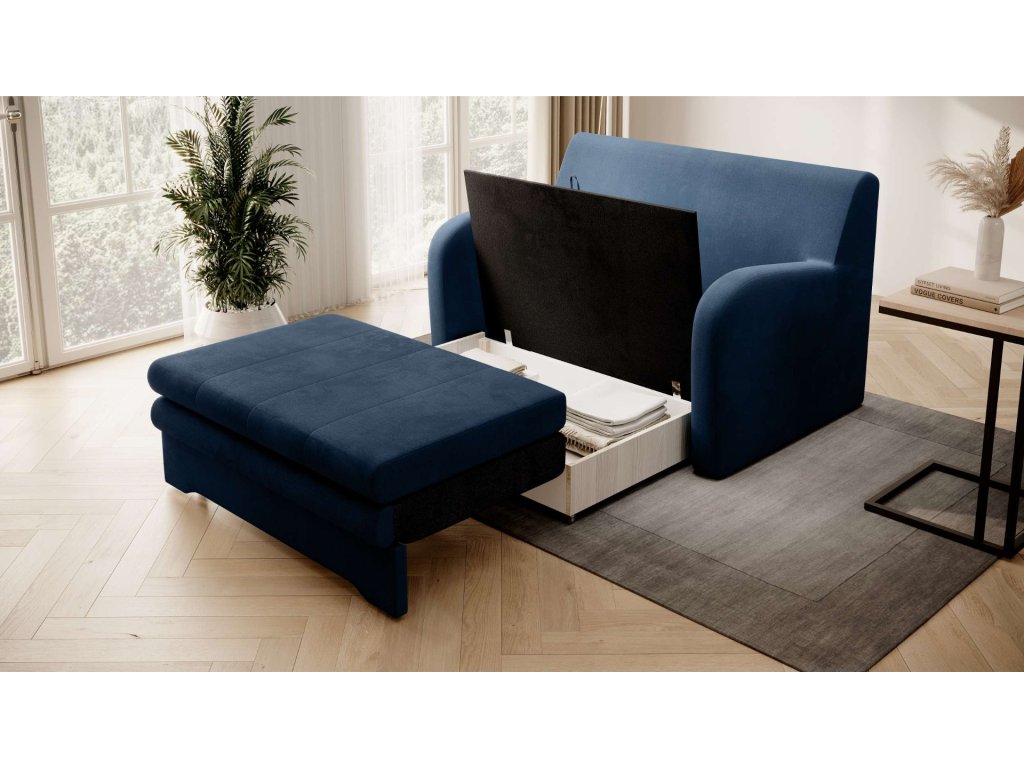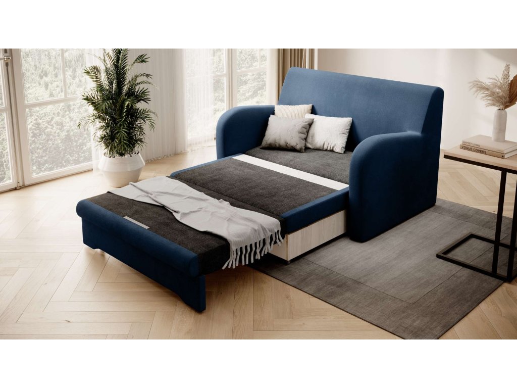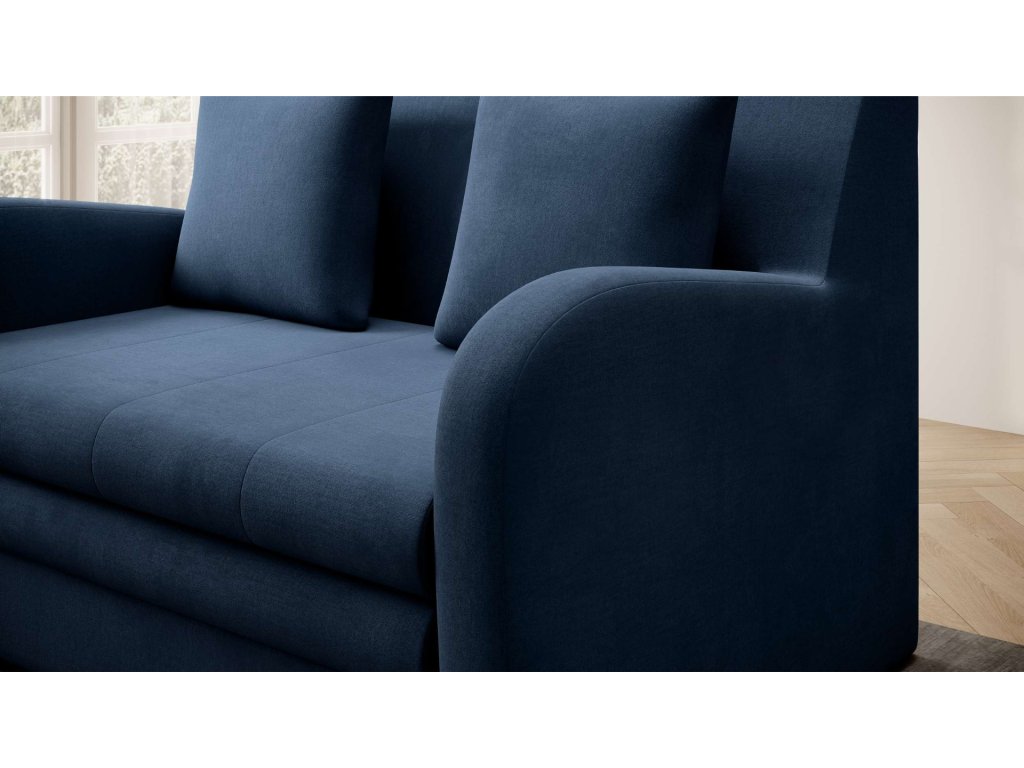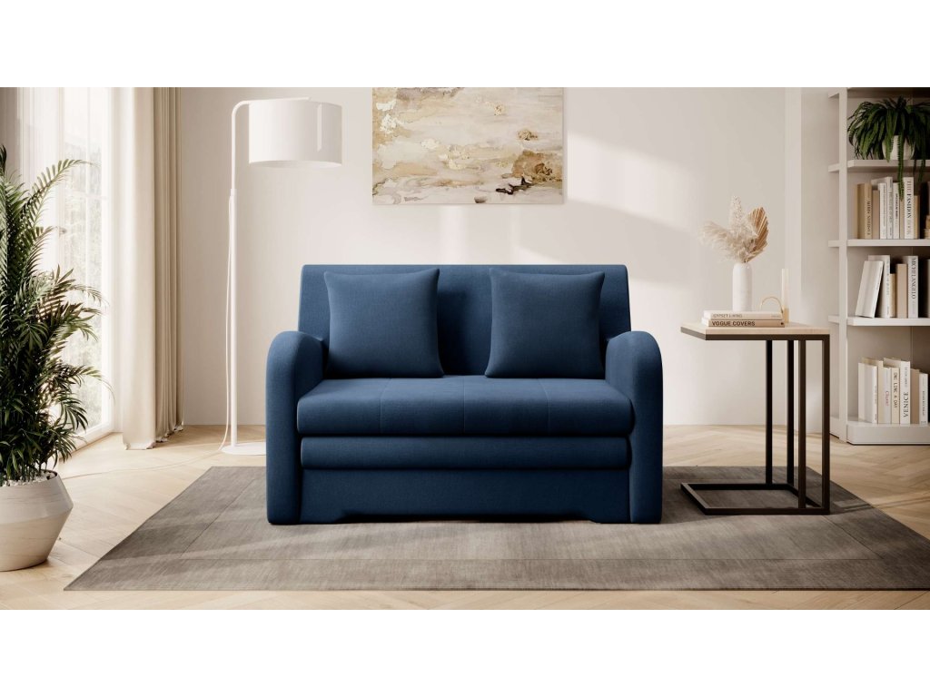Stylová a adaptabilní. Modrá rozkládací pohovka ARIBA je navržena tak, aby se hodila do moderního i tradičního interiéru.