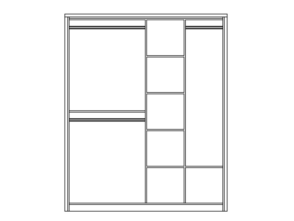 Šatní skříň s posuvnými dveřmi v moderním provedení. Korpus i dveře jsou z kvalitní LTD v barvě bílá mat ( obrázek je ilustrační ). Dveře jsou osazeny zrcadlem. Uspořádání polic viz obrázek. Hrany u skříně jsou ohraničeny ABS páskou. Dodáváme v demontovaném stavu.