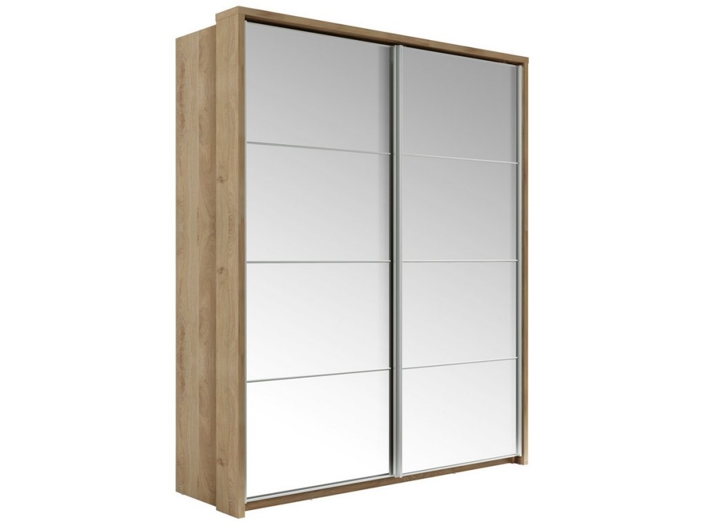 Šatní skříň s posuvnými dveřmi v moderním provedení. Korpus i dveře jsou z kvalitní LTD v barvě dub Shetland. Dveře jsou osazeny zrcadlem. Uspořádání polic viz obrázek. Hrany u skříně jsou ohraničeny ABS páskou. Dodáváme v demontovaném stavu.