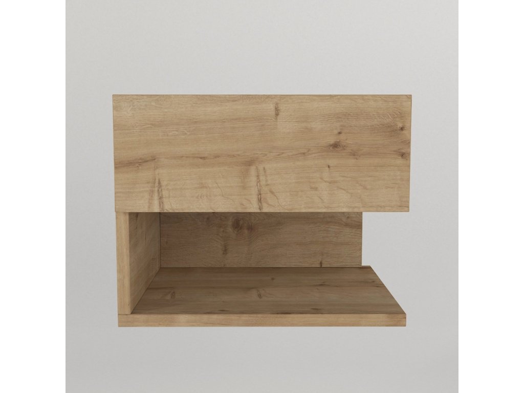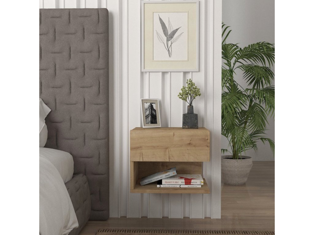 Moderní noční stolek ARTUS je ideální do moderně zařízených prostor a díky uchycení na zeď působí v ložnici vzdušně a minimalisticky. Disponuje praktickou zásuvkou a odkládací policí pro odkládání knih, telefonu či jiných drobností.