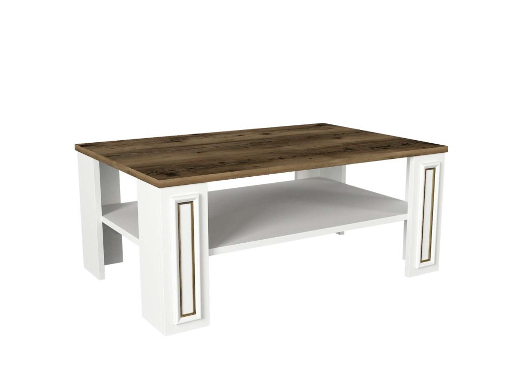 Konferenční stolek ARYA je ideální volbou pro ty, kteří hledají moderní a funkční nábytek. Jeho kombinace bílé a ořechové barvy a minimalistický design přinášejí do vašeho domova svěžest a moderní styl, zatímco poskytují dostatek úložného prostoru pro všechny vaše potřeby.