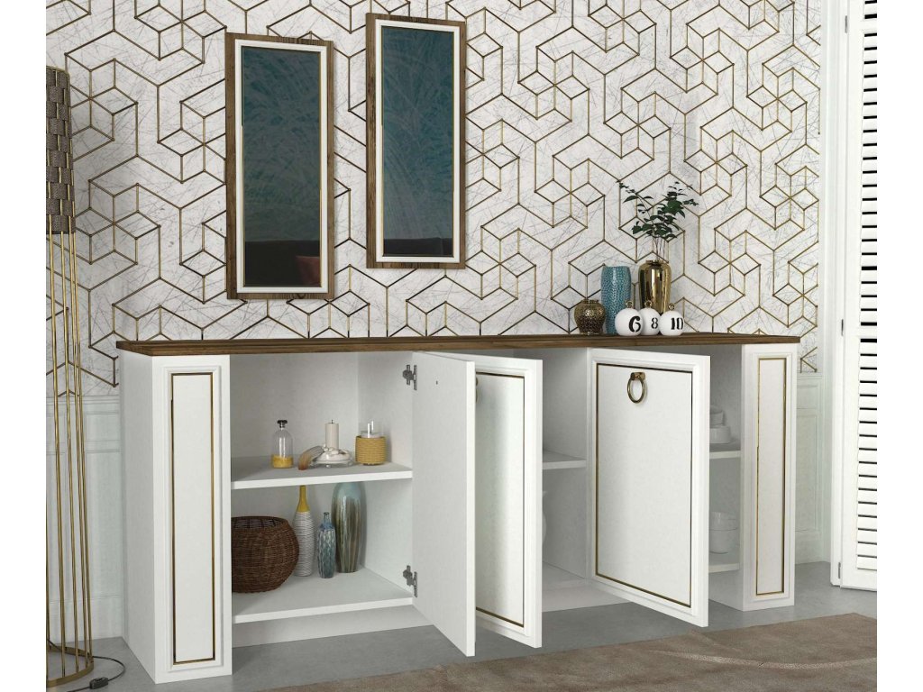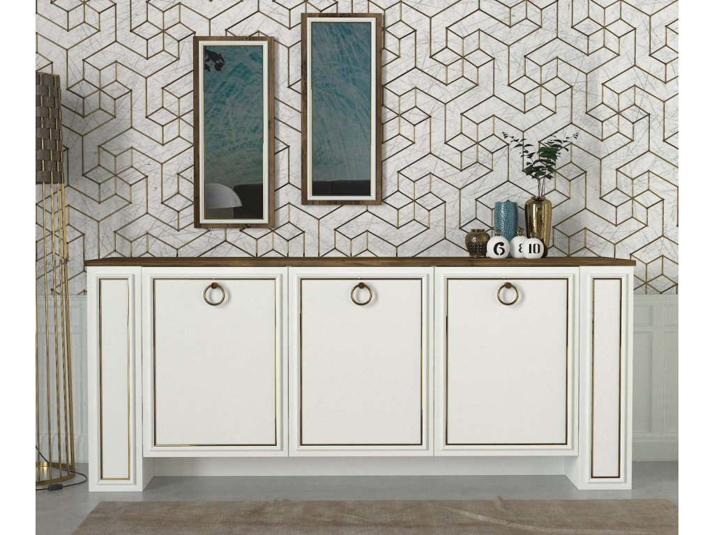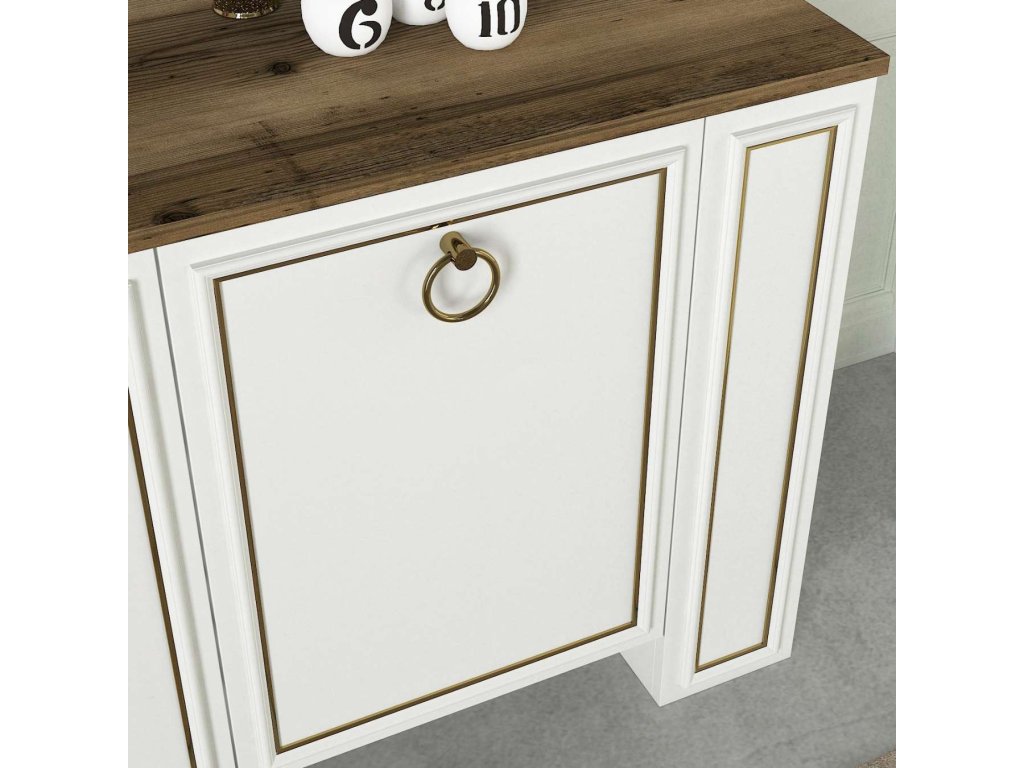 Komoda ARYA M je vyrobena z kvalitního LTD materiálu a skla s tloušťkou 18 mm, což zajišťuje její pevnost a dlouhou životnost. Elegantní kombinace bílé barvy a ořechového dekoru dodává komodě moderní a sofistikovaný vzhled, který se hodí do jakéhokoliv interiéru. Komoda je vybavena třemi dvířky, které poskytují dostatek úložného prostoru pro vaše potřeby.