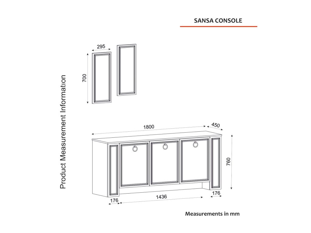 - Sestava obsahuje: Komoda (š180 x h45 x v76 cm), 2x nástěnné zrcadlo (š30 x h2 x v70 cm)