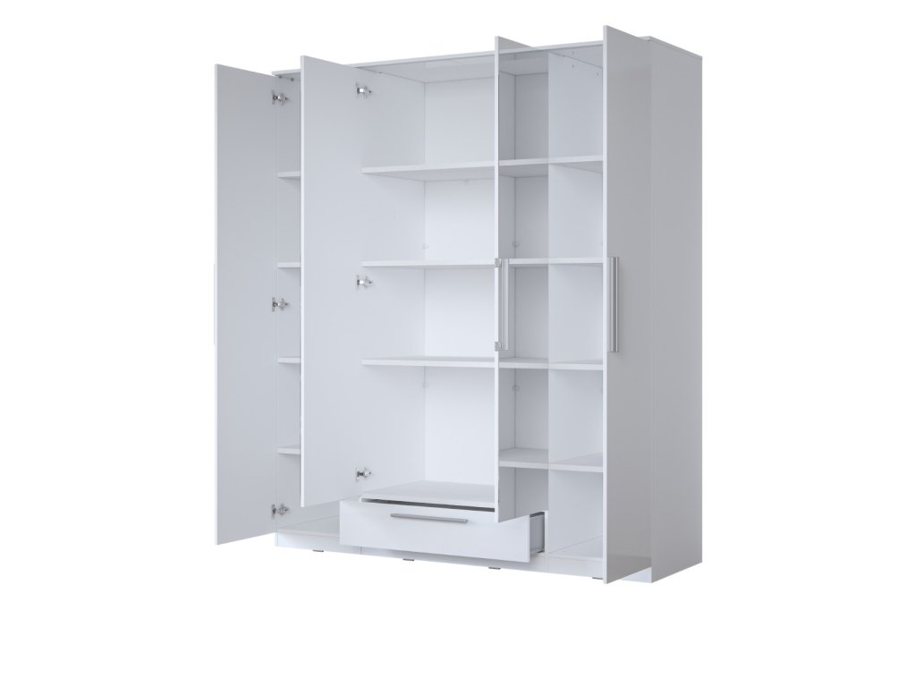 Prostorná a elegantní šatní skříň ASIA nabízí dostatek úložného prostoru pro vaši garderobu. Skříň disponuje čtyřmi dveřmi, jednou zásuvkou, třemi šatními tyčemi a dvěma policemi. Moderní RGB podsvícení dodává skříni exkluzivní vzhled a vytváří stylovou atmosféru ve vaší ložnici.