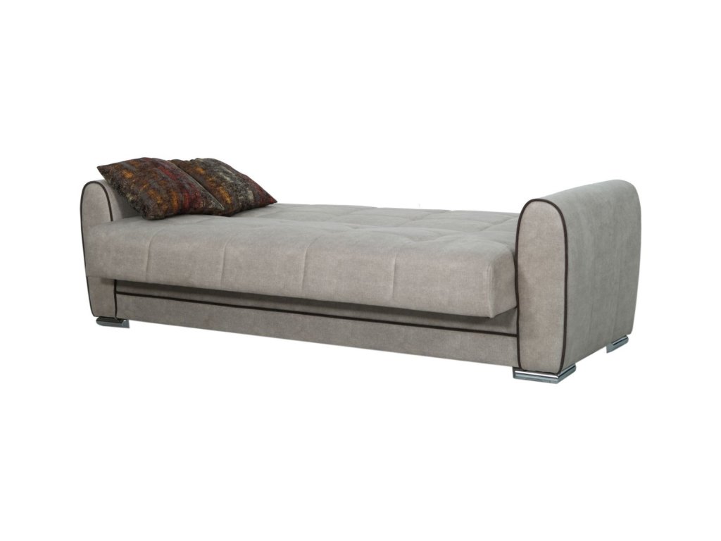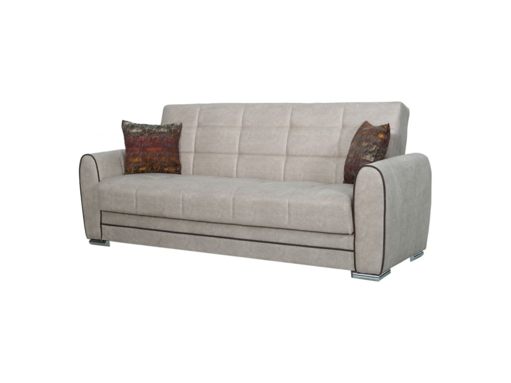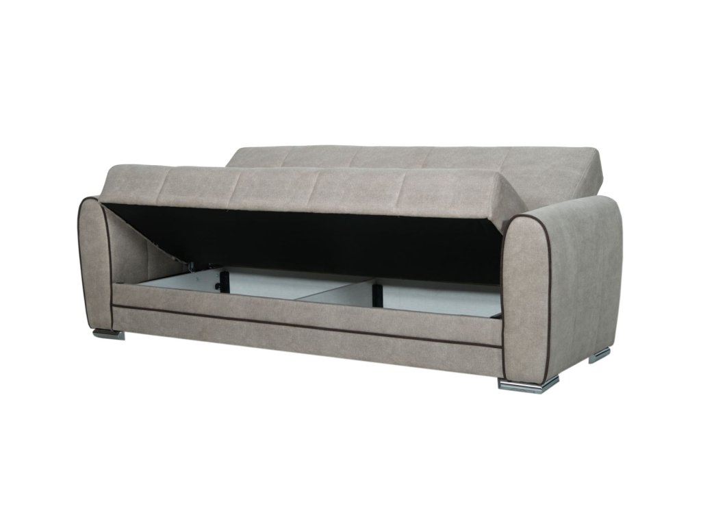 Třímístná pohovka ASLAN s funkcí spaní a úložným prostorem bude praktickým kouskem do každého interiéru. Pohovka je ideální pro každodenní odpočinek, ale také vhodné místo ke spaní nejen pro vás, ale i vaše hosty. Za komfort sezení a spaní jsou zodpovědné pružiny Bonnell a vysoce kvalitní PUR pěna. ÚLOŽNÝ PROSTOR pod sedákem poskytuje dostatek prostoru pro uskladnění ložního prádla či přikrývek. Pohovka je čalouněna kvalitní potahovou látkou v béžové barvě a stojí na chromových nožičkách.