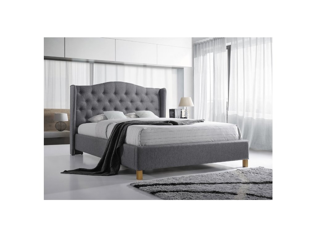 Elegantní čalouněná postel ASPENA očalouněná šedou látkou. Tvarované čelo postele je prošívané s ozdobnými knoflíčky ve stejné barvě jako je čalounění postele. Přední nožičky jsou vyrobeny z přírodního dřeva. V ceně postele je klasický lamelový rošt v plastových pouzdrech. Matraci je třeba doobjednat, doporučená velikost 140x200 cm. Rozměry: výška čela: 124 cm šířka: 158 cm hloubka: 216 cm . Dodáváme v demontu.Doplňkové parametry