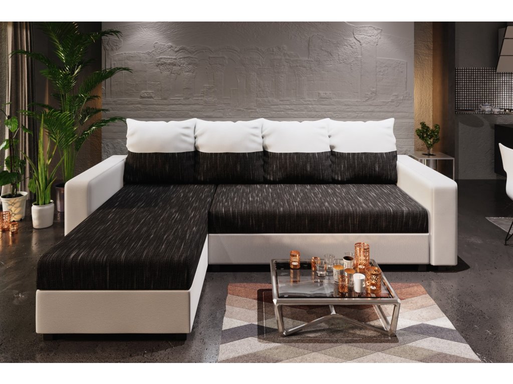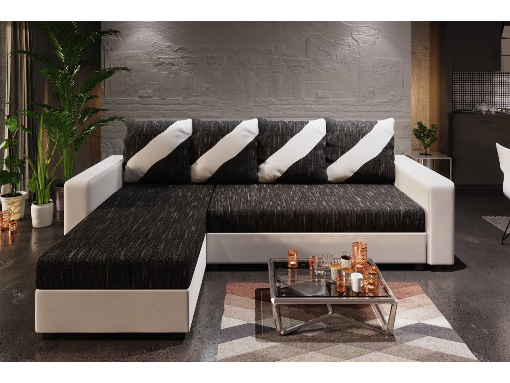 Moderní rozkládací sedačka menších rozměrů ASTANIA L v potahovém provedení KORNET 10/DOLARO 511 v levém rohu má opěradlo tvořené čtyřmi dvoubarevnými polštáři, které mají z jedné strany vodorovné pruhy a ze strany druhé šikmé pruhy. Můžete si tak otočením polštářů měnit vzhled sedačky. Každý polštář má praktické zapínání na zip.