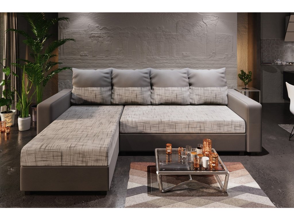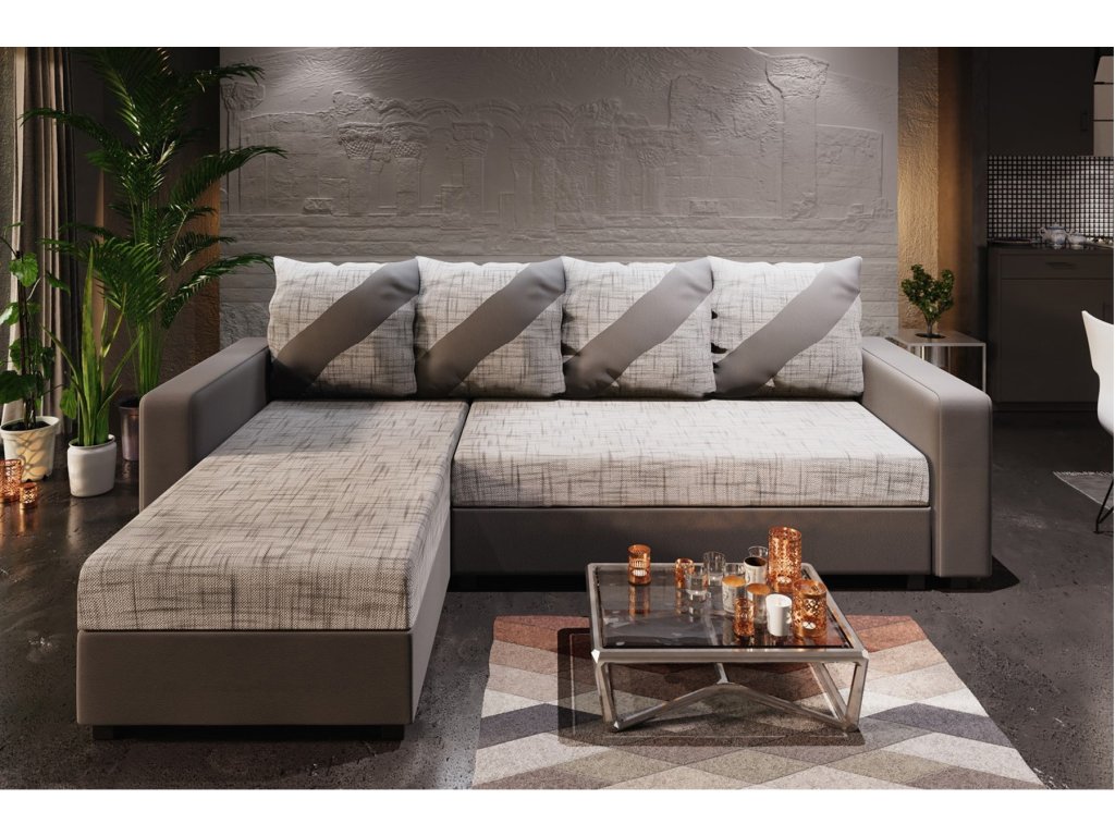 Moderní rozkládací sedačka menších rozměrů ASTANIA L v potahovém provedení KORNET 18/DOLARO 4 v levém rohu má opěradlo tvořené čtyřmi dvoubarevnými polštáři, které mají z jedné strany vodorovné pruhy a ze strany druhé šikmé pruhy. Můžete si tak otočením polštářů měnit vzhled sedačky. Každý polštář má praktické zapínání na zip.