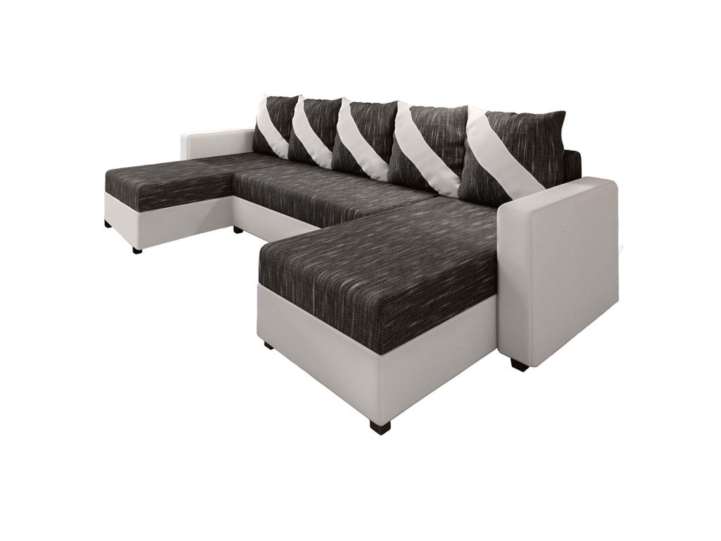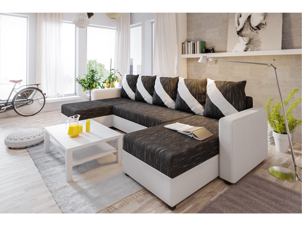 Moderní rozkládací účková sedačka ASTANIA U v potahovém provedení KORNET 10/DOLARO 511 má opěradlo tvořené dvoubarevnými polštáři, které mají z jedné strany vodorovné pruhy a ze strany druhé šikmé pruhy . Můžete si tak otočením polštářů měnit vzhled sedačky. Každý polštář má praktické zapínání na zip.