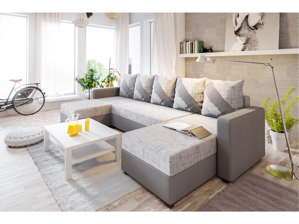 Moderní rozkládací účková sedačka ASTANIA U v potahovém provedení KORNET 18/DOLARO 4 má opěradlo tvořené dvoubarevnými polštáři, které mají z jedné strany vodorovné pruhy a ze strany druhé šikmé pruhy . Můžete si tak otočením polštářů měnit vzhled sedačky. Každý polštář má praktické zapínání na zip.