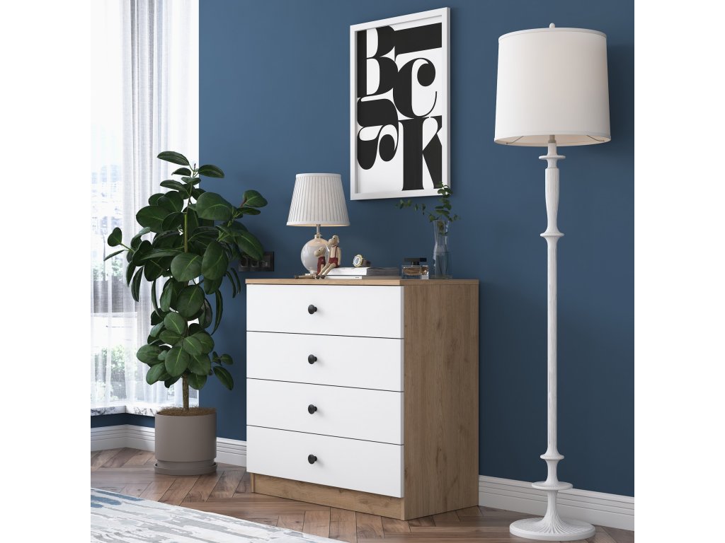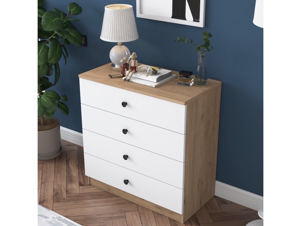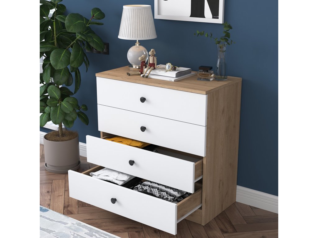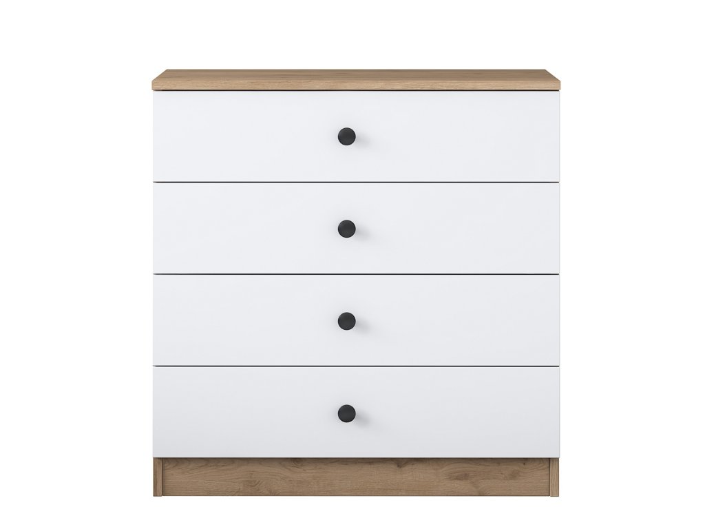 Komoda ATHEN je vybavena čtyřmi prostornými zásuvkami, které jsou ideální pro uložení drobností, dokumentů nebo dalších nezbytností. Odolné materiály, jako je melamin a VT laminát, zajišťují dlouhou životnost a snadnou údržbu.
