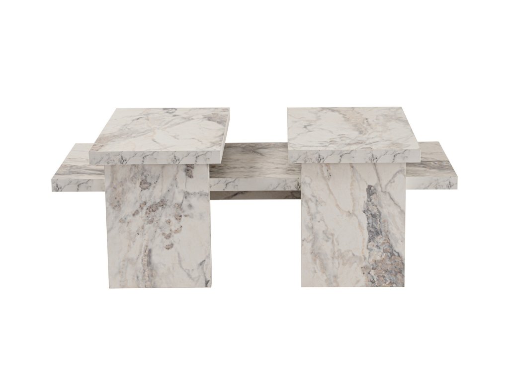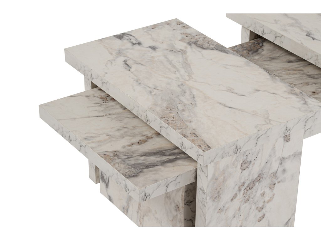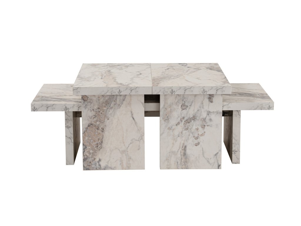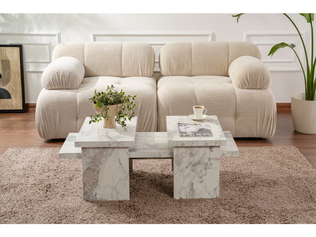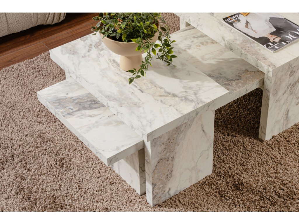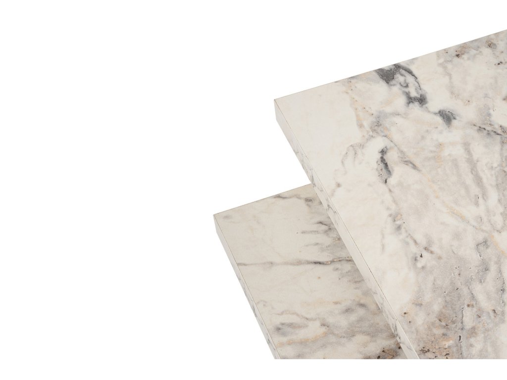 Sada konferenčních stolků z mramoru Freesia je vyrobena ze 100% dřevotřísky s melaminovým povlakem, což zaručuje odolnost a dlouhou životnost. Tloušťka 18 mm zvyšuje robustnost stolků, díky čemuž jsou ideální pro každodenní použití.