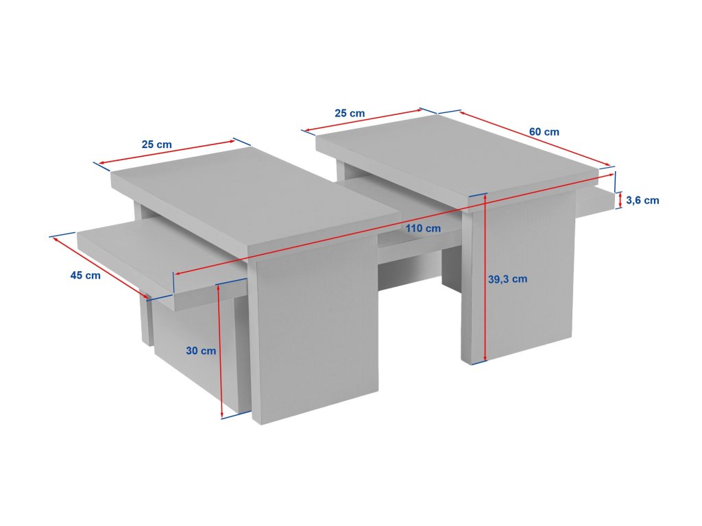 Sada obsahuje velký stůl o rozměrech 110 cm na šířku, 30 cm na výšku a 45 cm na hloubku a také malý stolek o rozměrech 25 cm na šířku, 39,3 cm na výšku a 60 cm na hloubku. Tento všestranný design vám umožňuje uspořádat stolky v různých konfiguracích, které vyhovují vašemu prostoru a stylu.