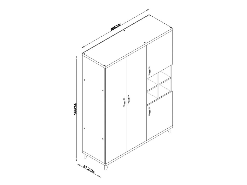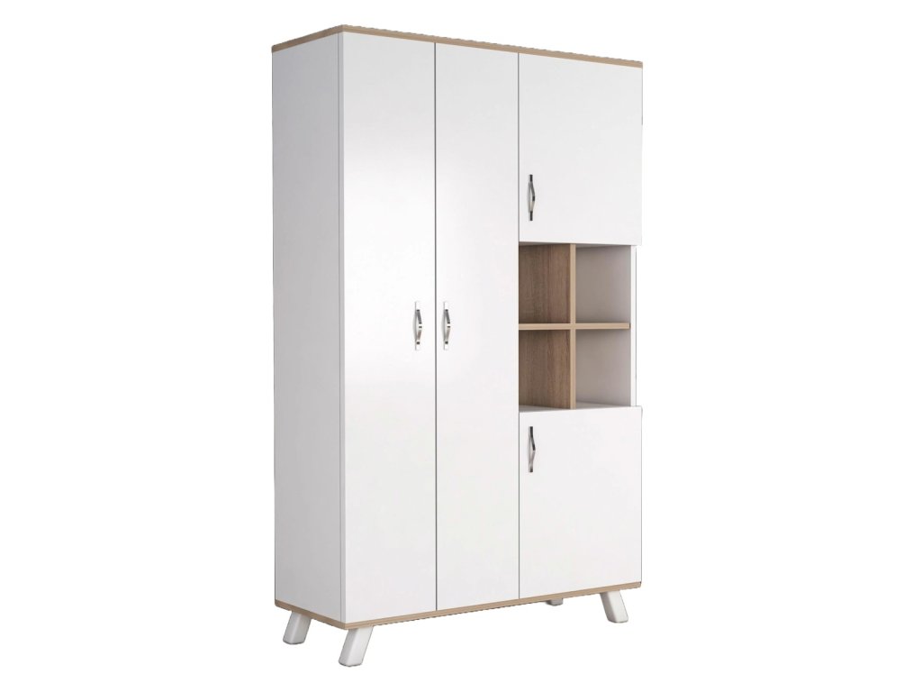 Skříň nabízí prostorné otevírací dveře pro snadný přístup k vašim věcem a stojí na elegantních nožičkách. Vyrobena z kvalitní dřevotřísky potažené melaminem, zaručuje dlouhou životnost a snadnou údržbu.