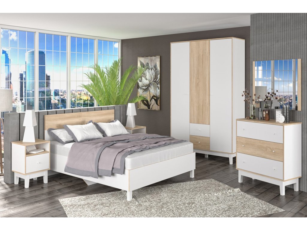 Ložnicový sektor AXEL to je atraktivní design a elegantní styl s precizními detaily. Svým jemným barevným provedením dub samoa a bílá prosvětlí celý interiér a zajistí dokonalé místo pro relaxaci. Součástí sektoru je zrcadlo, které je velmi stylové a můžete si jej zavěsit nad komodu AXEL.