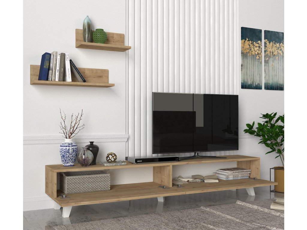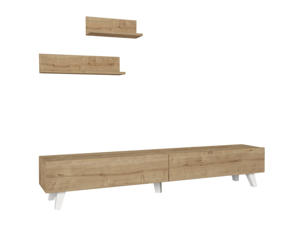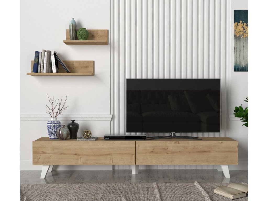 Stylový TV stolek na nožičkách AZIA vás okouzlí svým minimalistickým designem a příznivou cenou. Tento nábytek je charakteristický přírodní kresbou dřeva, která je doplněna bílými moderními nožičkami. TV skříňka poskytuje dostatek úložného prostoru ve formě skříněk s výklopem. Bonusem jsou závěsné police v ceně, které ideálně poslouží k vystavení dekorací či knih.
