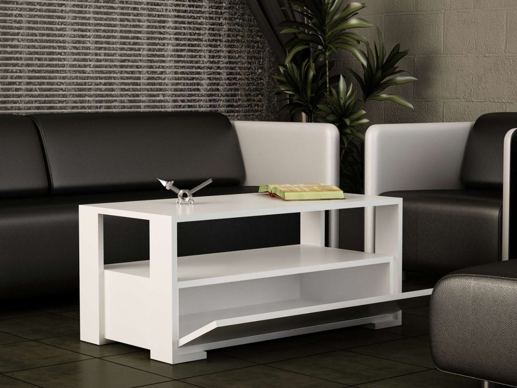 Konferenční stolek BALERINA kombinuje moderní design s funkčností. Bílá barva dodává interiéru svěžest a čistotu, zatímco praktické odkládací police a skříňka poskytují dostatek úložného prostoru pro všechny vaše potřeby. Obdélníkový tvar je ideální pro umístění před pohovku, kde může sloužit nejen jako stylový prvek, ale i jako praktický pomocník pro vaše každodenní aktivity.