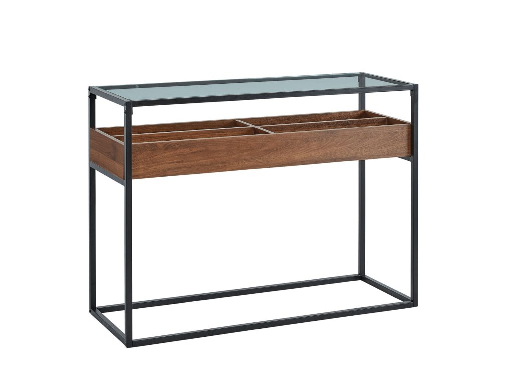 Deska stolku je vyrobena z tvrzeného skla. Úložný prostor je z kvalitních LTD desek v barvě ořech. Rám stolu je vyroben z kovu v černé barvě. Je v obdélníkovém tvaru.