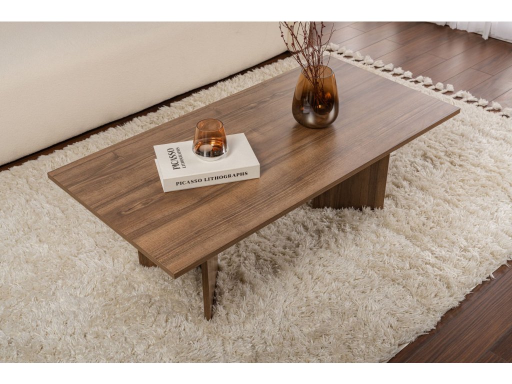Proměňte svůj obývací pokoj v útulné a stylové útočiště s naším nádherným konferenčním stolkem z ořechového dřeva. Tento konferenční stolek je vyroben ze 100% dřevotřísky s melaminovým potahem a vyzařuje eleganci a sofistikovanost. Jeho elegantní design a teplá ořechová barva okamžitě pozvednou atmosféru vašeho prostoru a vytvoří příjemnou atmosféru pro vás i vaše hosty.