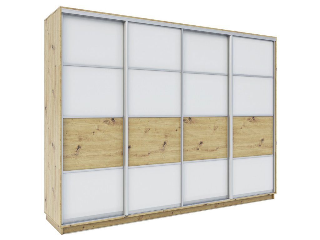 BALTIMORE je velká šatní skříň se 4 posuvnými dveřmi. Tuto skříň Vám nabízíme v žádaném bílém barevném provedení. Korpus skříně je v barevném provedení dub Artisan, přední dveřní část je v kombinaci bílá + dub Artisan. Skříň je efektně propojena s úchytkami a kováním ve stříbrné barvě/aluminium.