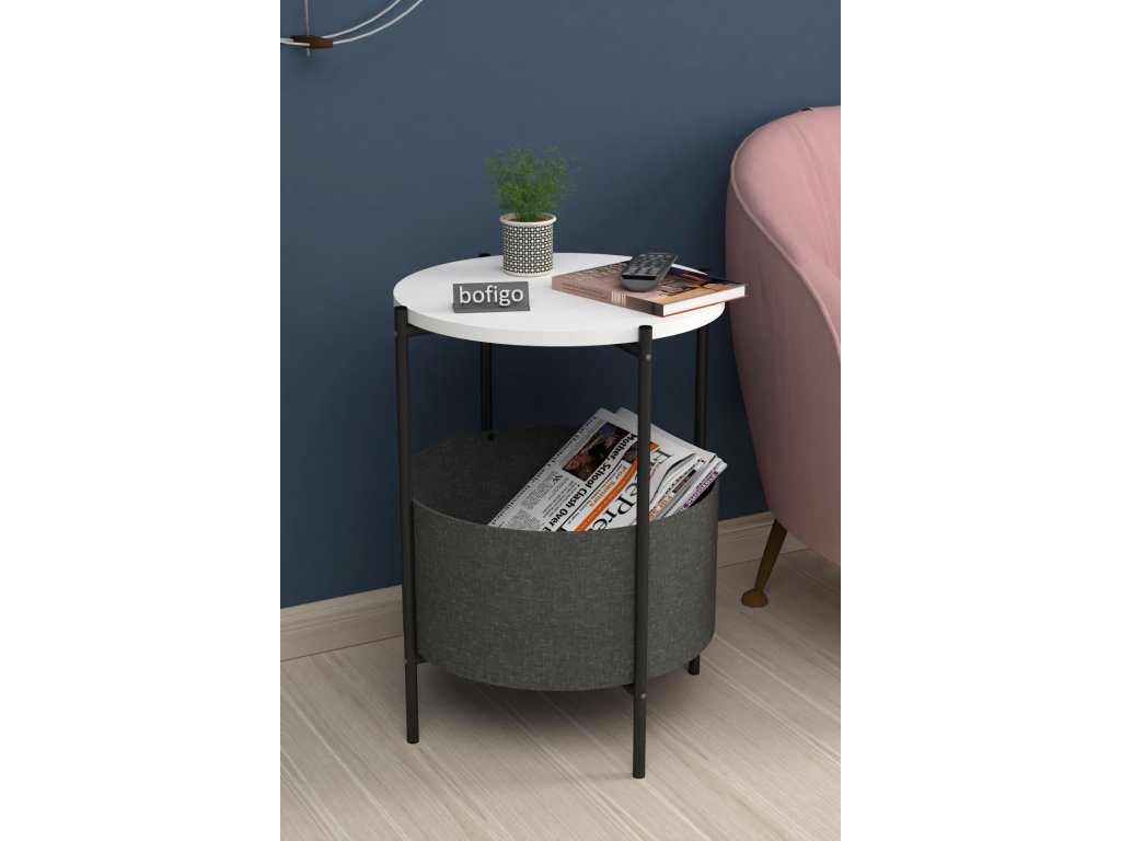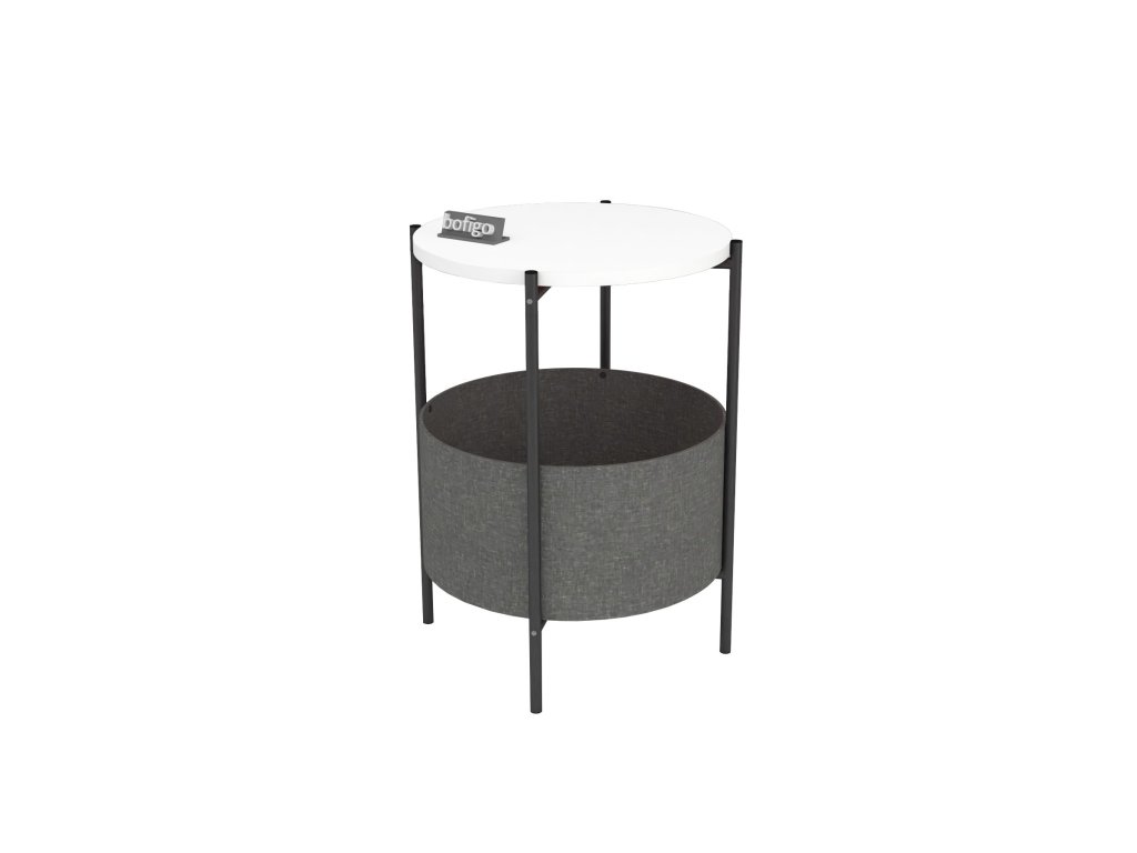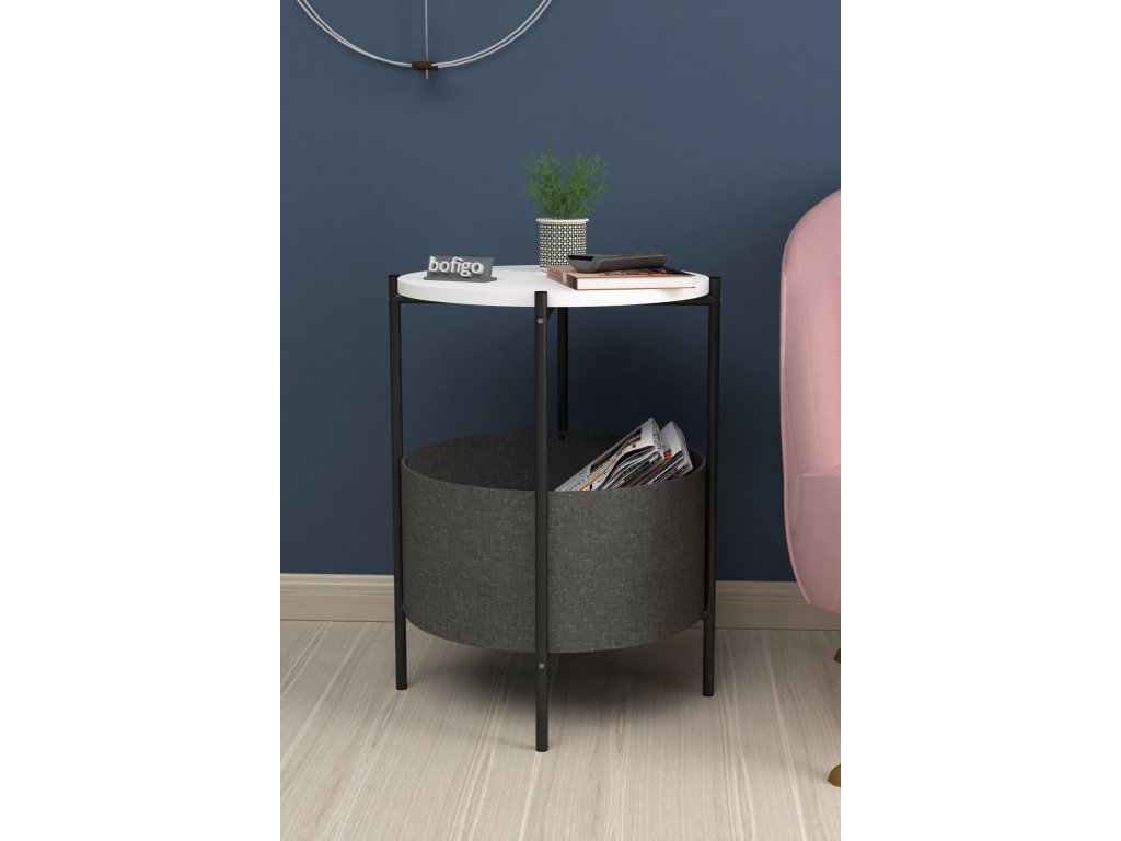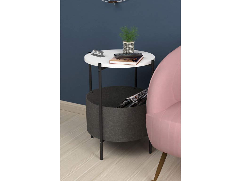 Vrchní deska stolku je z LTD materiálu, který je nenáročný na údržbu. Tloušťka 18 mm. Konstrukce je z kovu v černém barevném provedení. Košík pro uložení věcí je vyroben z kvalitní látky. Lze jej vyprat.