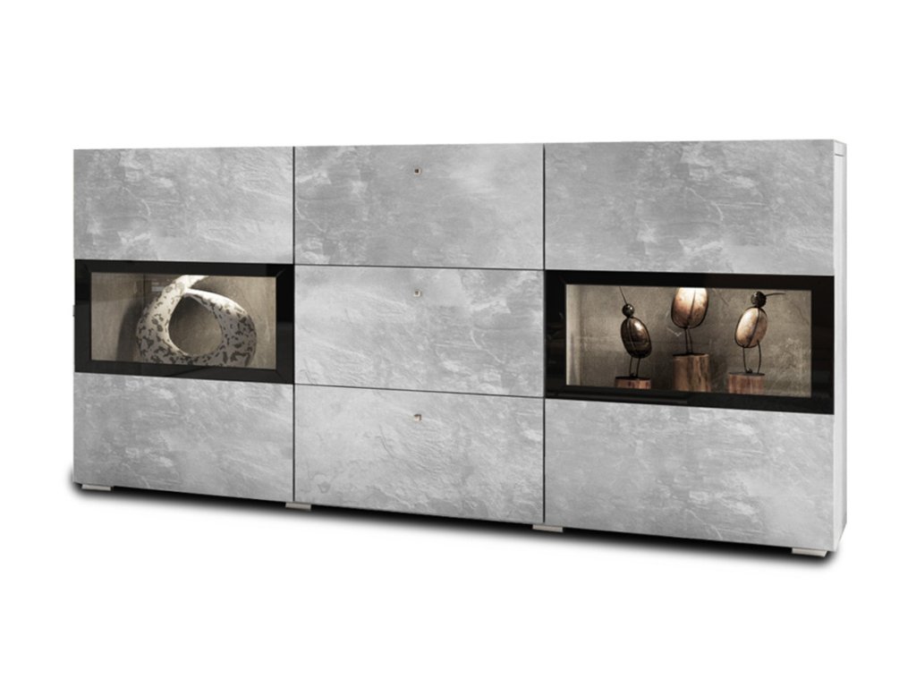 Stylová a moderní komoda BARLY je pro náročné klienty, kteří hledají originální řešení. Je vybavena třemi prostornými šuplíky a dvojicí prosklených dvířek. Dvířka mají kolem skleněné výplně dekorativní rámy černé barvy, které dodávají komodě na atraktivitě. Jedinečnost jí dodává módní barevné provedení světlého betonu, ak tomu vkusné a jemné úchyty na šuplících. Dvířka mají bezúchytový systém. Je vyrobena z kvalitní LTD desky, která se snadno udržuje. Doporučujeme dokoupit LED osvětlení, viz doporučení. Ve stejné barvě a designu máme v nabídce také obývací sestavu BARLY. Rozměry: - šířka 132 cm, výška 70 cm, hloubka 39 cm. Dodáváme v demontu.Doplňkové parametry
