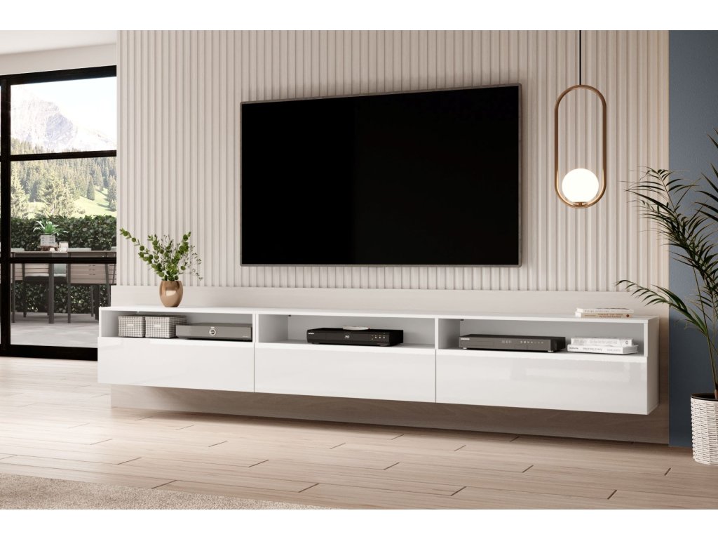 TV skříňka může stát na podlaze ale díky věšákům, které jsou součástí sestavy se může velmi rychle stát závěsným kusem nábytku. V zadních částech poskytuje praktické otvory pro vedení kabelů na TV příslušenství a jinou elektroniku. Komoda je tvořena třemi výklopnými dvířky s bezúchytkovým systémem. Barevné provedení bílá, výklopná dvířka bílý lesk.
