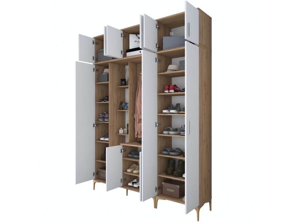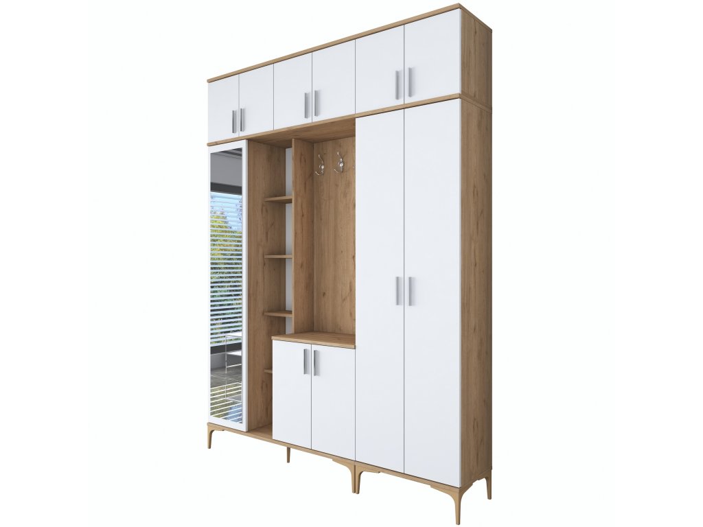 | Sestava obsahuje: | skříň se zrcadlem, skříňka na boty, věšáky, šatní skříň, závěsná skříň |