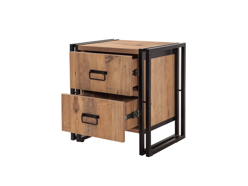 Noční stolek BEAR je vybaven dvěma zásuvkami, které poskytují dostatek úložného prostoru pro vaše potřeby. Zásuvky jsou ideální na uskladnění knih, elektroniky nebo jiných drobností, které chcete mít po ruce. Černé kovové detaily a robustní konstrukce podtrhují jeho industriální charakter.