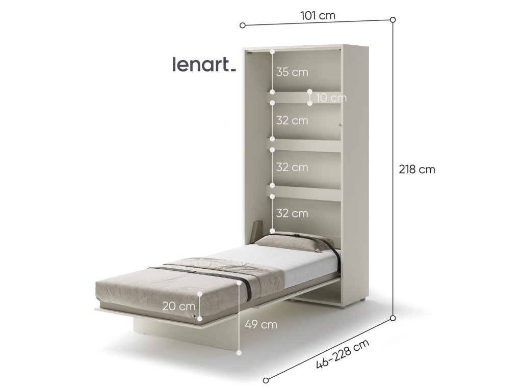 Vysoká výklopná postel 90 kašmír (béžová s nádechem šedé). Rozměry viz obrázek. Se sklápěcí postelí Vás už nebude trápit malý prostor Vaší domácnosti. Díky stabilní konstrukci zaručuje pohodlný odpočinek. Pneumatický mechanismus sklápění postele zajistí bezpečné otevírání a je doplněn SOFT CLOSE systémem tichého zavírání. Tento výjimečný systém Vám umožní manipulaci pouze jedním prstem. Když je postel sklopená, vypadá jako běžná skříň. Vyklopením se vytáhne celá délka postele. Při lozložení postele má hloubku 226 cm. Uvnitř skříně jsou praktické police na knížky nebo dekorační předměty, vše máte na dosah ruky. Maximální zatížení polic je 5 kg. Rám je nutno přišroubovat ke zdi, nosnost postele 100 kg. Rošt postele je v ceně, matrace není součástí, je potřeba ji dokoupit. Doporučujeme velikost 90 x 200 x výšku do 18 cm. Po sklopení postele vzniká prostor pod postelí o výšce 24,9 cm. Nábytek je vyroben z kvalitního lamina s ABS hranou. Lamino je odolné proti poškrábání, poškození, vlhkosti a vysokým teplotám. Postel nabízíme v několika velikostech a barevných provedeních. K posteli je možné dokoupit LED osvětlení. Dodáváme v demontovaném stavu. Můžete si prohlédnout prezentační video, klikněte ZDE.